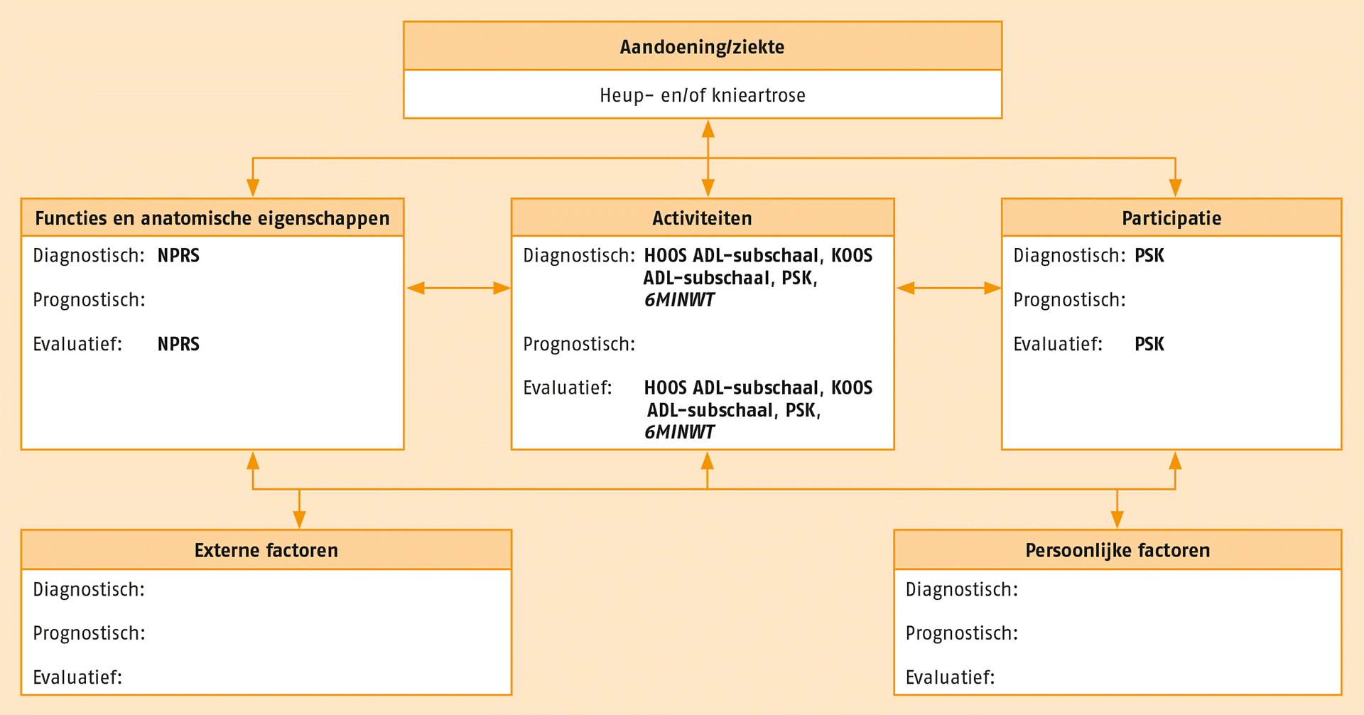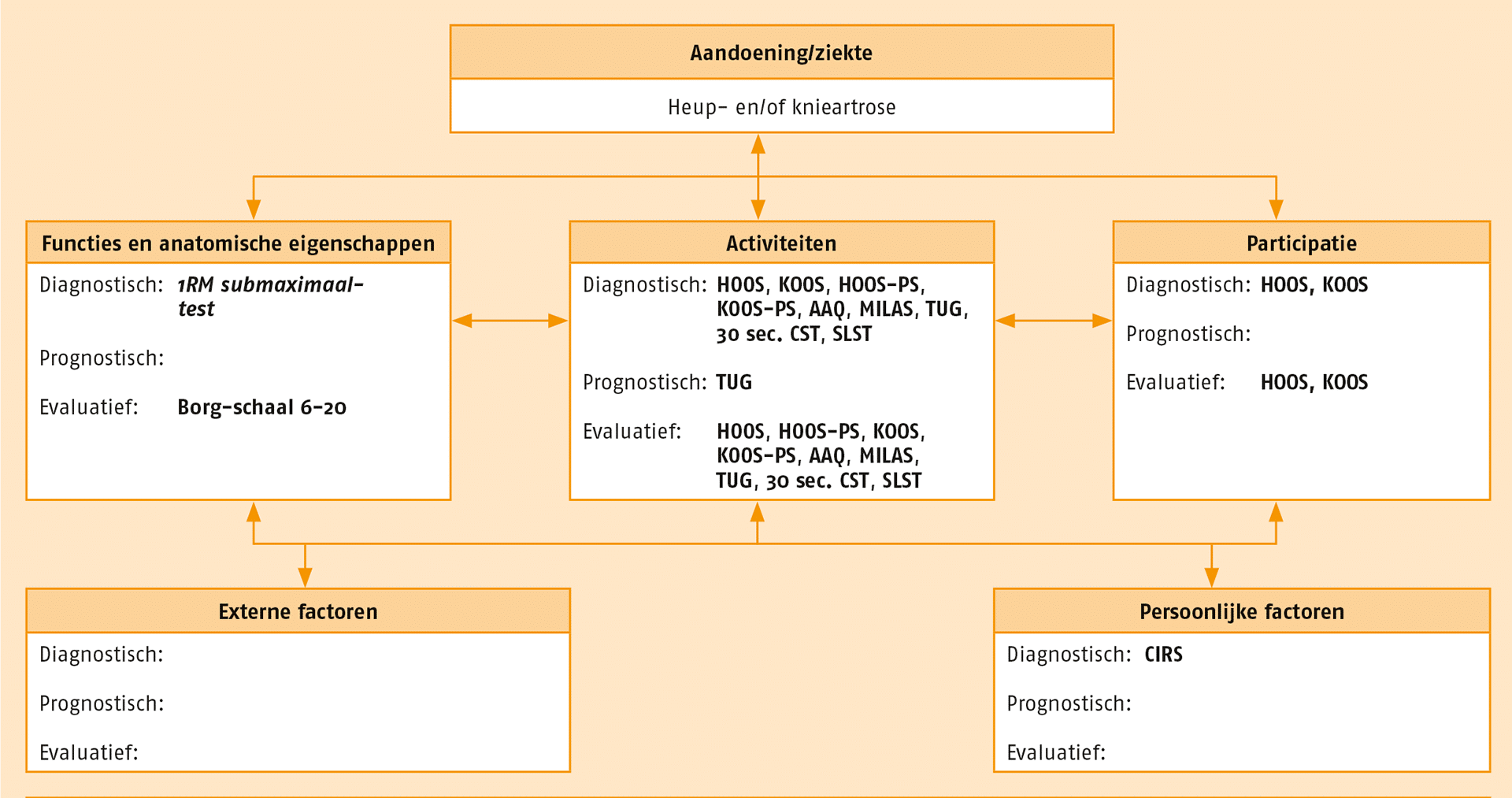 - De ‘Hip Injury Osteoarthritis Outcome Score’ (HOOS) ADL-subschaal of de ‘Knee Injury Osteoarthritis Outcome Score’ (KOOS) ADLsubschaal is een ondersteunende vragenlijst om het fysiek functioneren vast te leggen en om te gebruiken als nulmeting voor de behandeling.