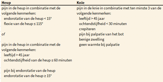 De criteria voor het stellen van de diagnose heup- of knieartrose op grond van zowel klinische als radiologische kenmerken zijn ontwikkeld in de tweedelijnssetting en kunnen daardoor in de eerste lijn minder valide zijn (zie de volgende tabel).