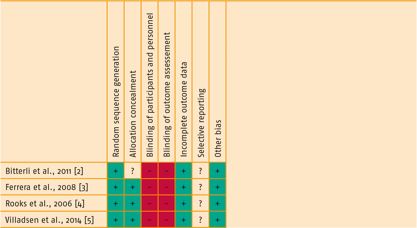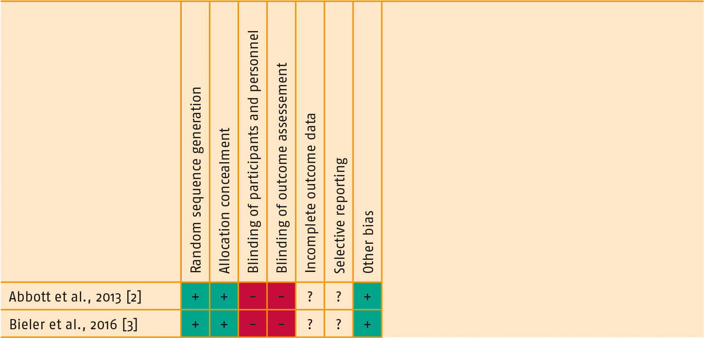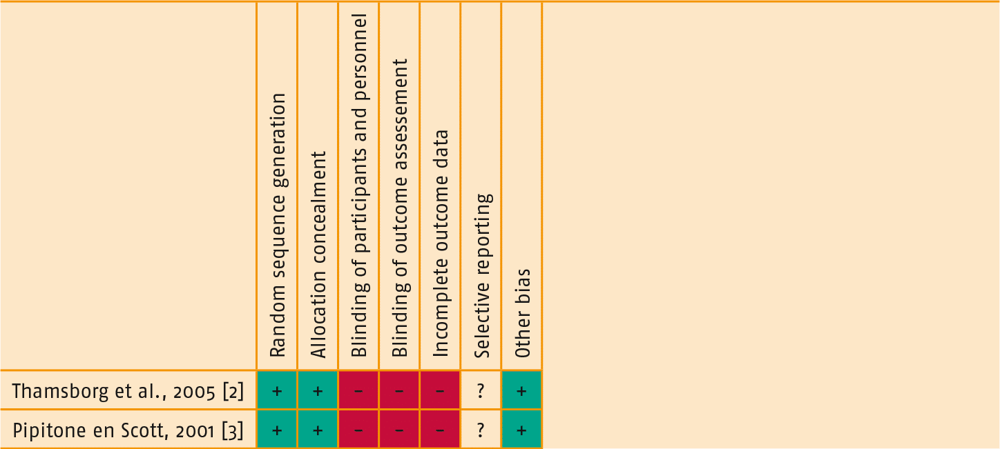 | 3, n = 119 | redelijk RoB | nee, I2 = 0% | nee | ja, n = 119 | nee | 59 | 60 | SMD = 0,11 (95%-BI = -0,26 tot 0,46 | laag1 |