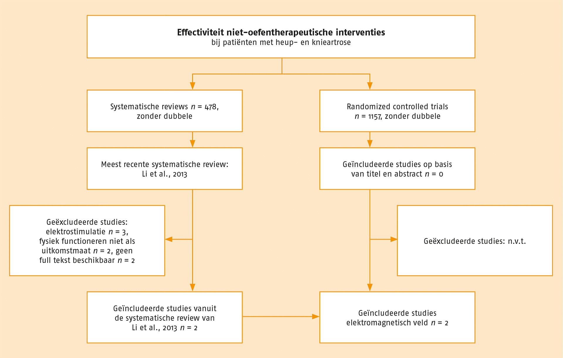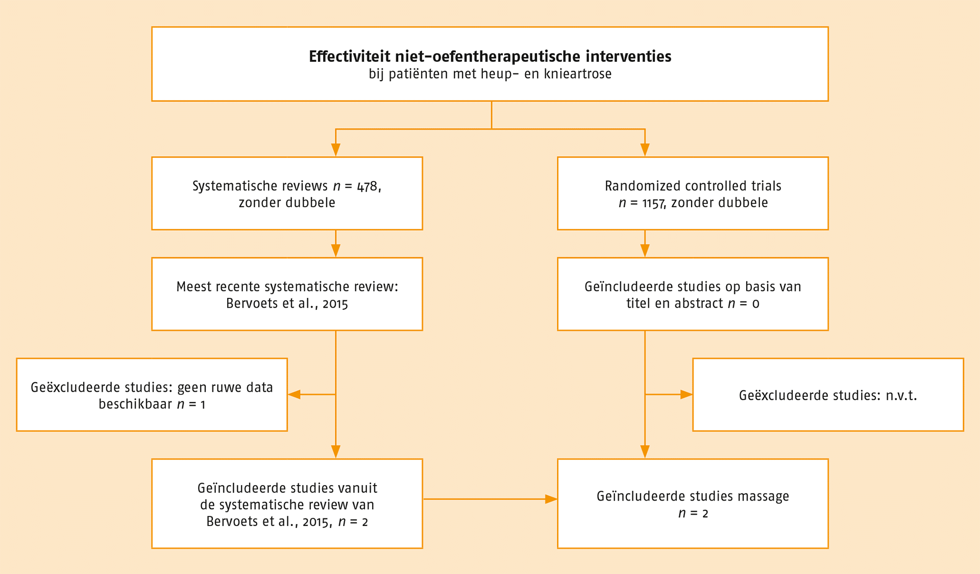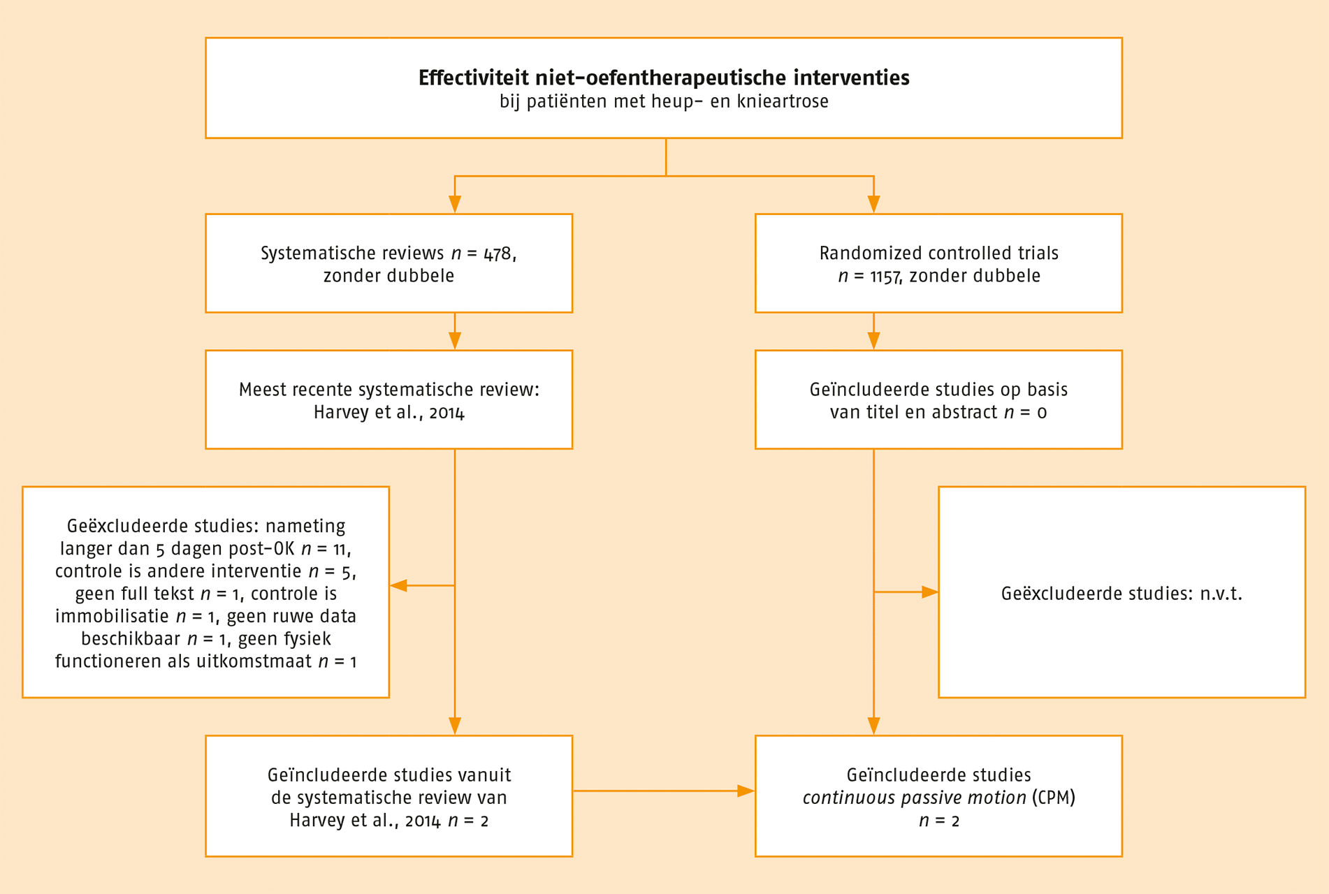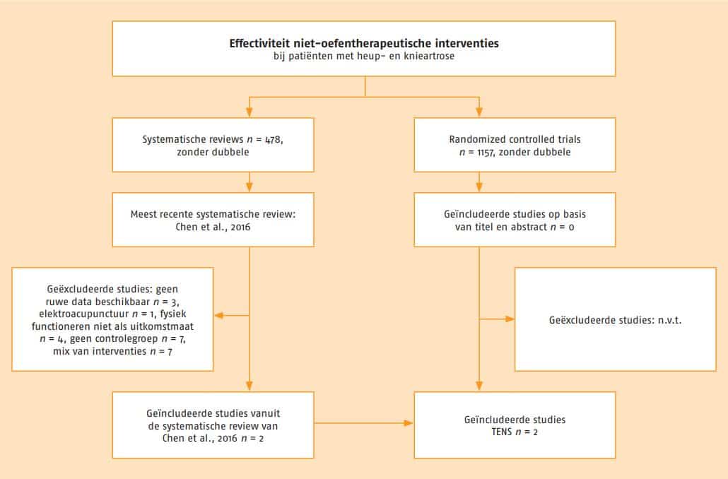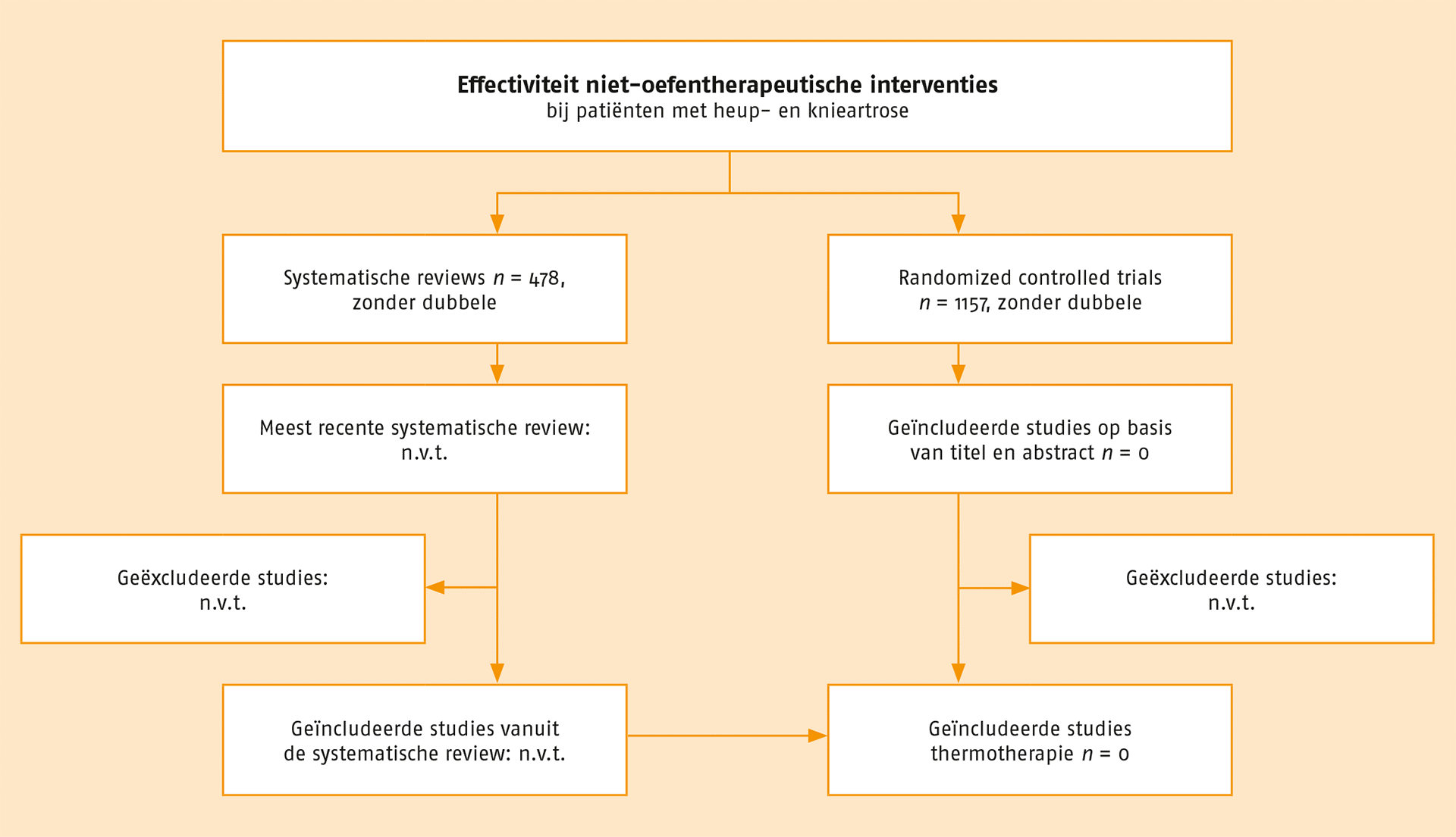 De literatuursearch met betrekking tot niet-oefentherapeutische interventies, waaronder thermotherapie, bij patiënten met heup- en knieartrose leverde 478 SR’s en 1157 RCT’s op. De zoekactie heeft echter geen SR’s of RCT’s opgeleverd die zich specifiek richtten op thermotherapie.