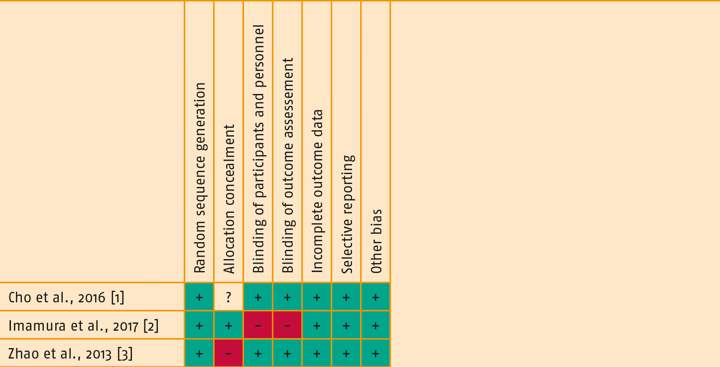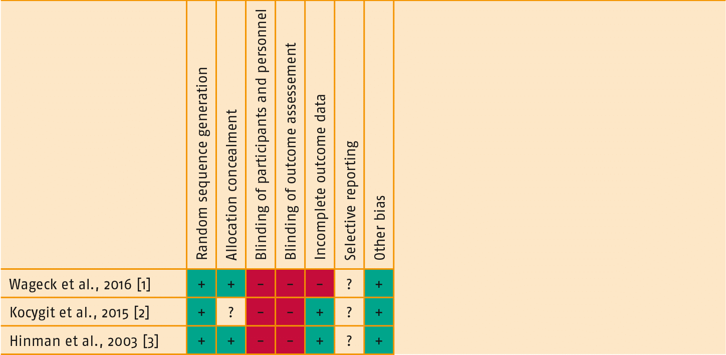 | 3, n = 193 | redelijk RoB | ja | nee | ja, n = 193 | ja | Zhao et al. (n = 70) vinden een significant verschil in effect op fysiek functioneren in het voordeel van shockwave vs. geen shockwave.[3] Twee studies, die van Cho et al. en die van Imamura et al. (n = 123) vinden geen verschil in effect op fysiek functioneren tussen de interventie- en de controlegroep.[1,2] | zeer laag1 |