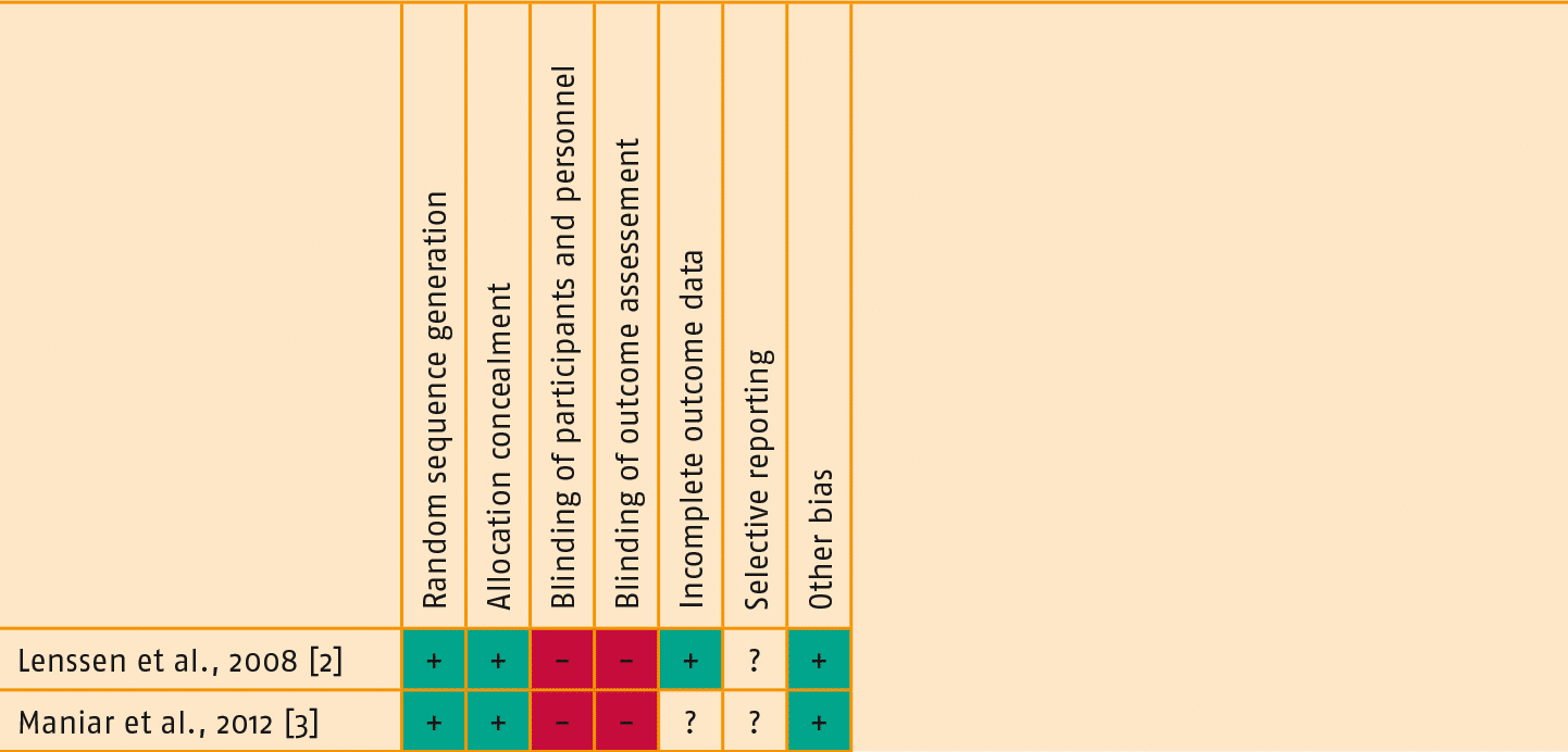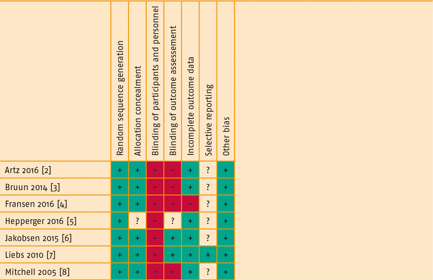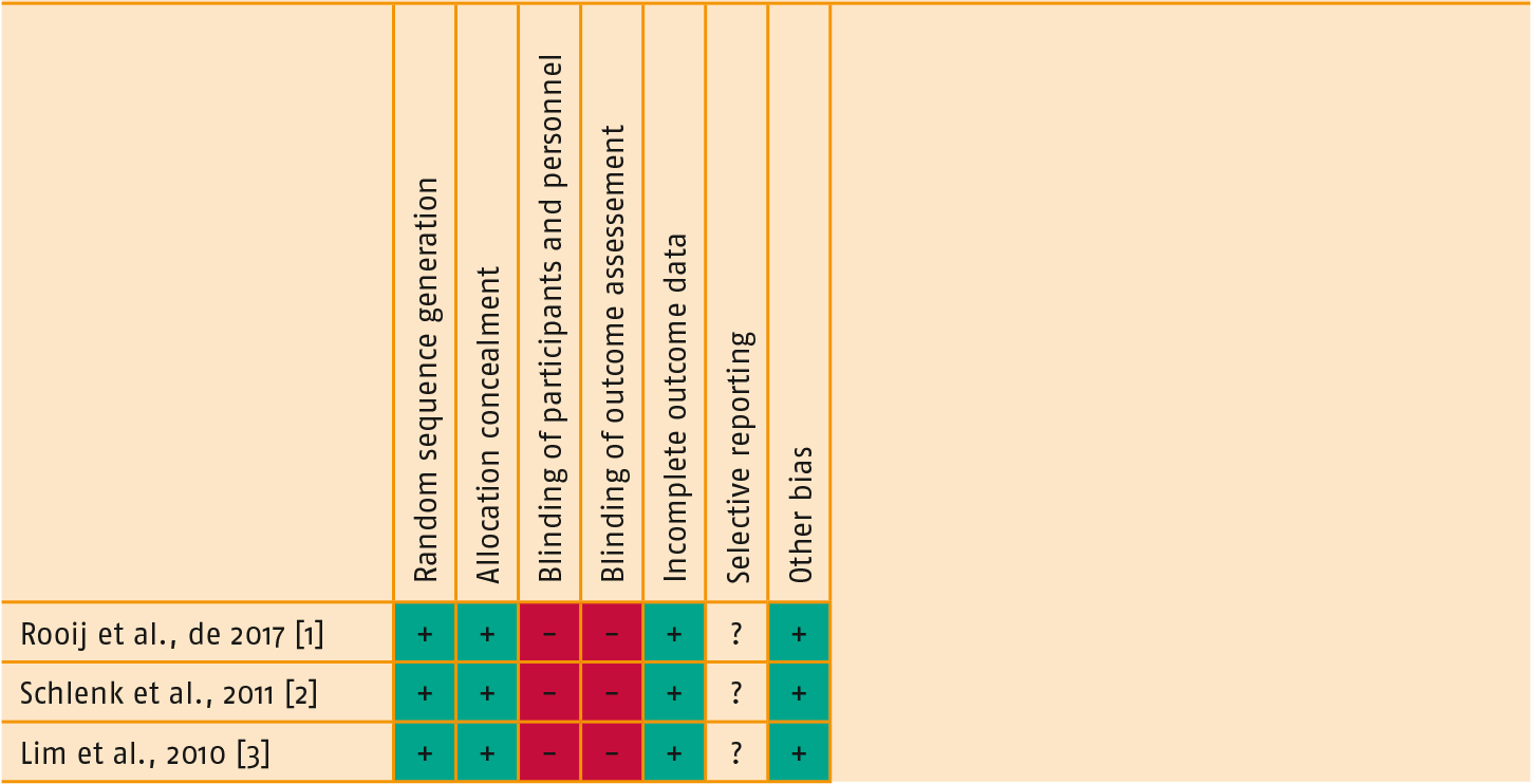 | 3, n = 138 | redelijk RoB | nee, I2 = 0% | nee | ja, n = 138 | ja | 69 | 69 | SMD = -0,01 (95%-BI = -0,43 tot 0,24) | laag1 |