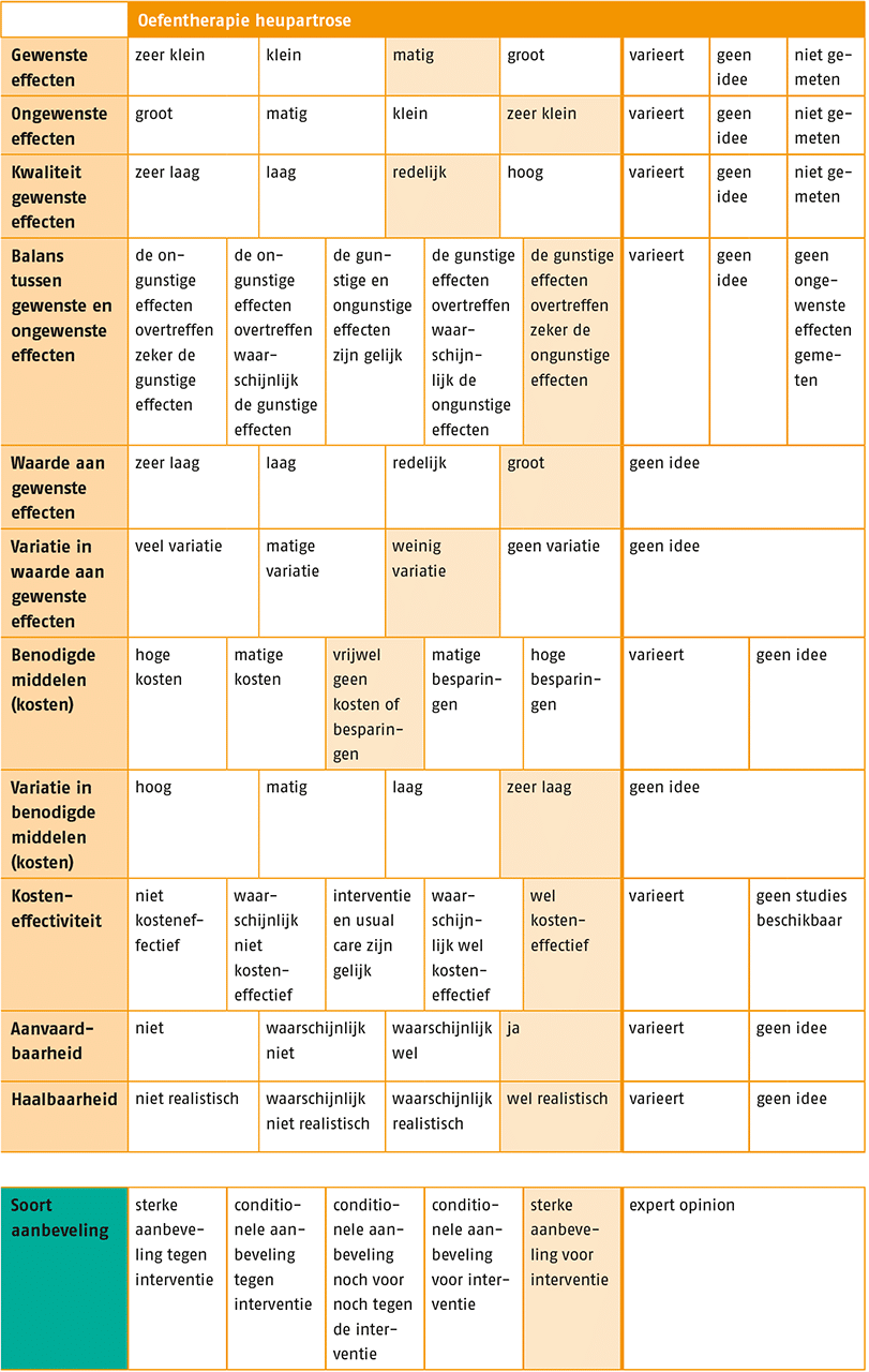 Er is bewijs van matige kwaliteit dat oefentherapie effectief is in het verbeteren van fysiek functioneren (matig effect) en pijn (matig effect). Op basis van de waarschijnlijkheid voor een (matig) effect, de beperkte neveneffecten, de aangetoonde kosteneffectiviteit en een hoge aanvaardbaarheid van oefentherapie is de werkgroep van mening dat de interventie sterk aanbevolen kan worden (‘bied de interventie aan’).