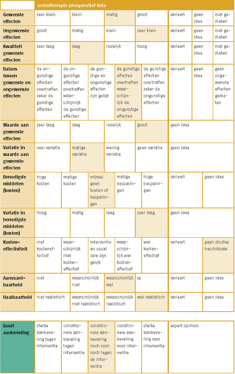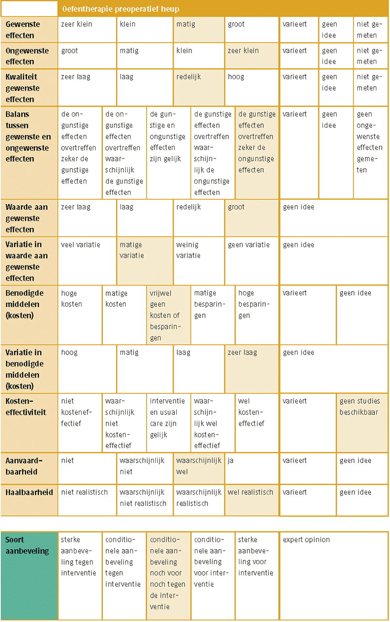 De implementatie van de interventie in de dagelijkse praktijk wordt door de werkgroep, met name in de con- servatieve fase, als aanvaardbaar en haalbaar ingeschat, omdat de interventie als meest aangewezen behan- deloptie wordt beschouwd en er geen specifieke middelen voor vereist zijn. Voor de pre- en postoperatieve fase wordt oefentherapie als waarschijnlijk aanvaardbaar en haalbaar ingeschat, dus met meer onzekerheid hierin.