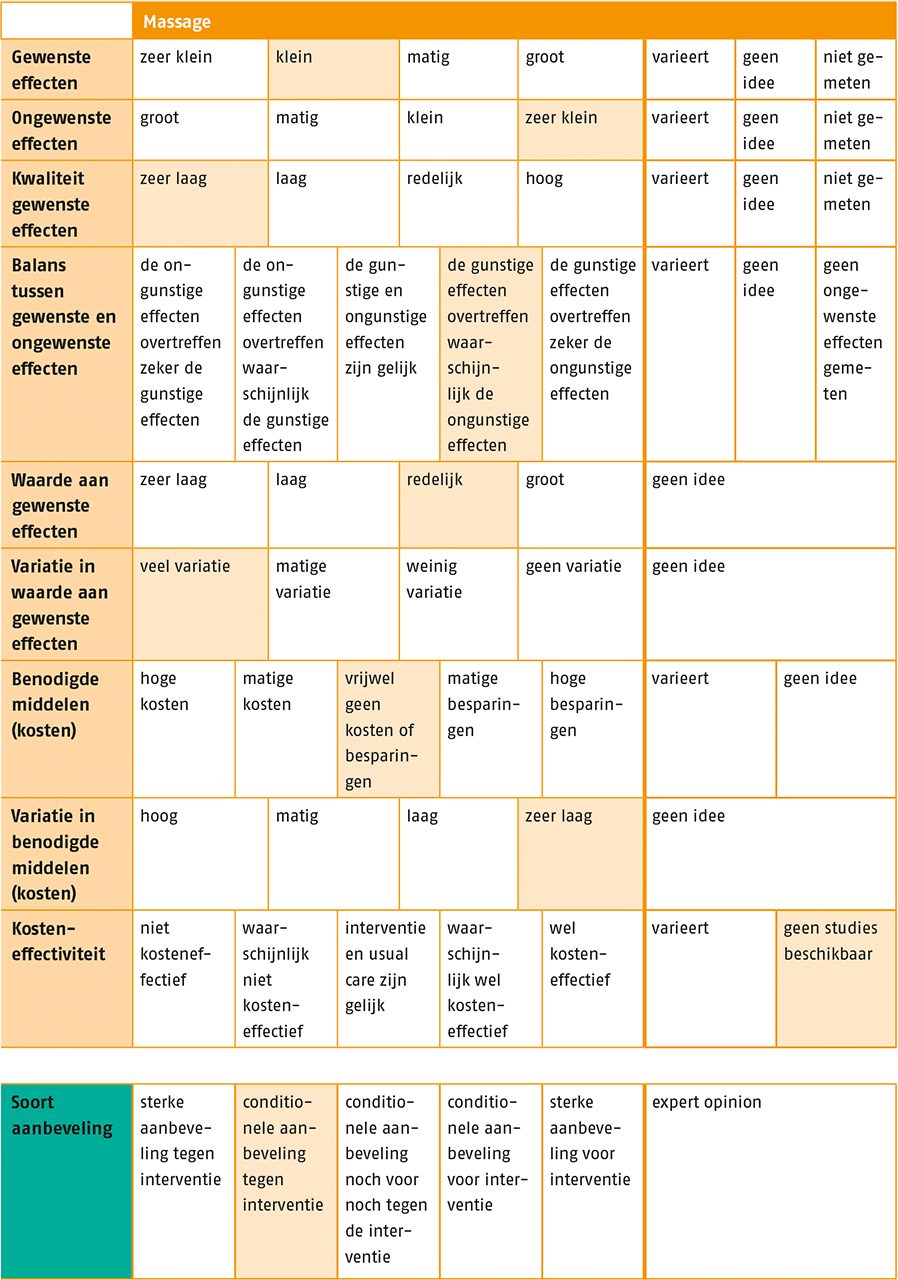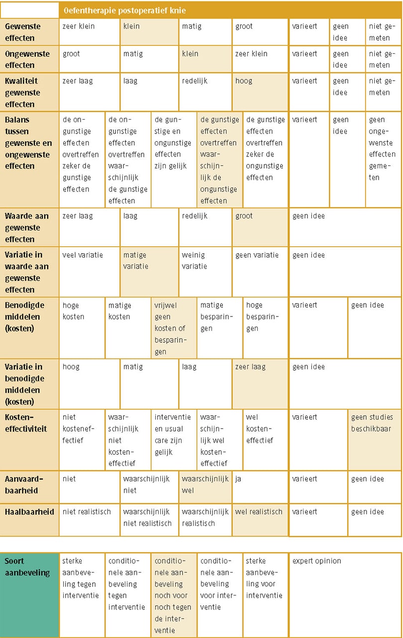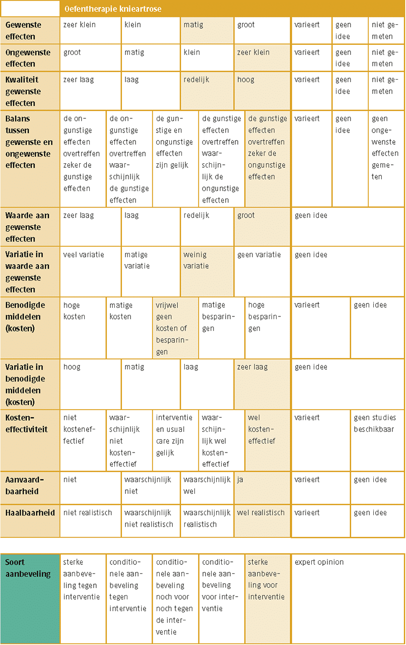 De gewenste effecten (zoals vermindering van klachten, verbetering in dagelijks functioneren) van oefenthera- pie lijken over het algemeen aanwezig te zijn, terwijl de ongewenste effecten (zoals verergering van klachten) zeldzaam en weinig ernstig lijken. Op basis hiervan wordt door de werkgroep ingeschat dat de gewenste ef- fecten de ongewenste effecten overstijgen.
