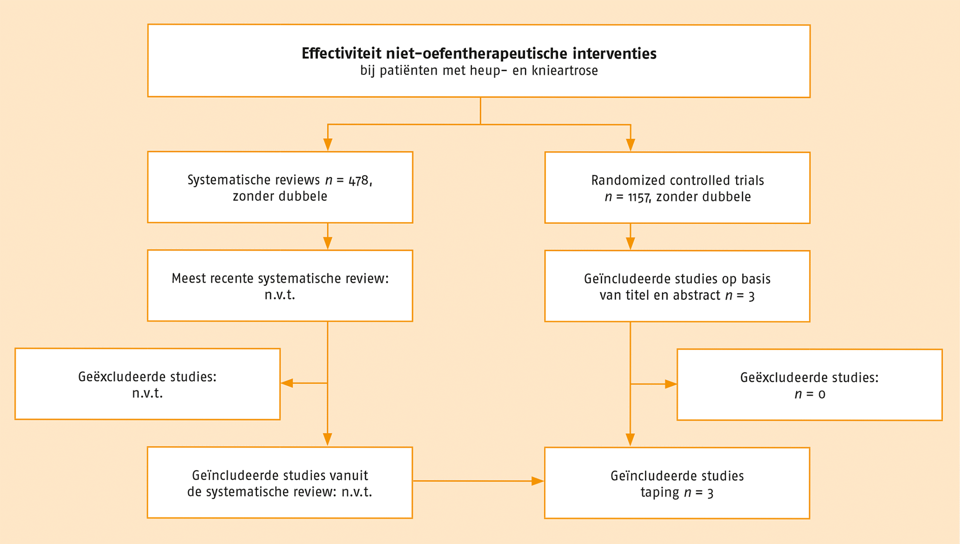 De literatuursearch met betrekking tot niet-oefentherapeutische interventies, waaronder behandeling met taping, bij patiënten met heup- en knieartrose leverde 478 systematische literatuurstudies (SR’s) en 1157 RCT’s op. Deze zoekactie leverde echter geen SR op die zich specifiek richtte op behandeling met taping. Wel werden er drie RCT’s gevonden die voldeden aan de selectiecriteria bij de uitgangsvraag.[1-3] Om de aanbeveling omtrent deze uitgangsvraag op basis van juiste argumentatie te kunnen formuleren, is voor deze specifieke interventie, op verzoek van de werkgroep, pijn als secundaire uitkomstmaat toegevoegd.