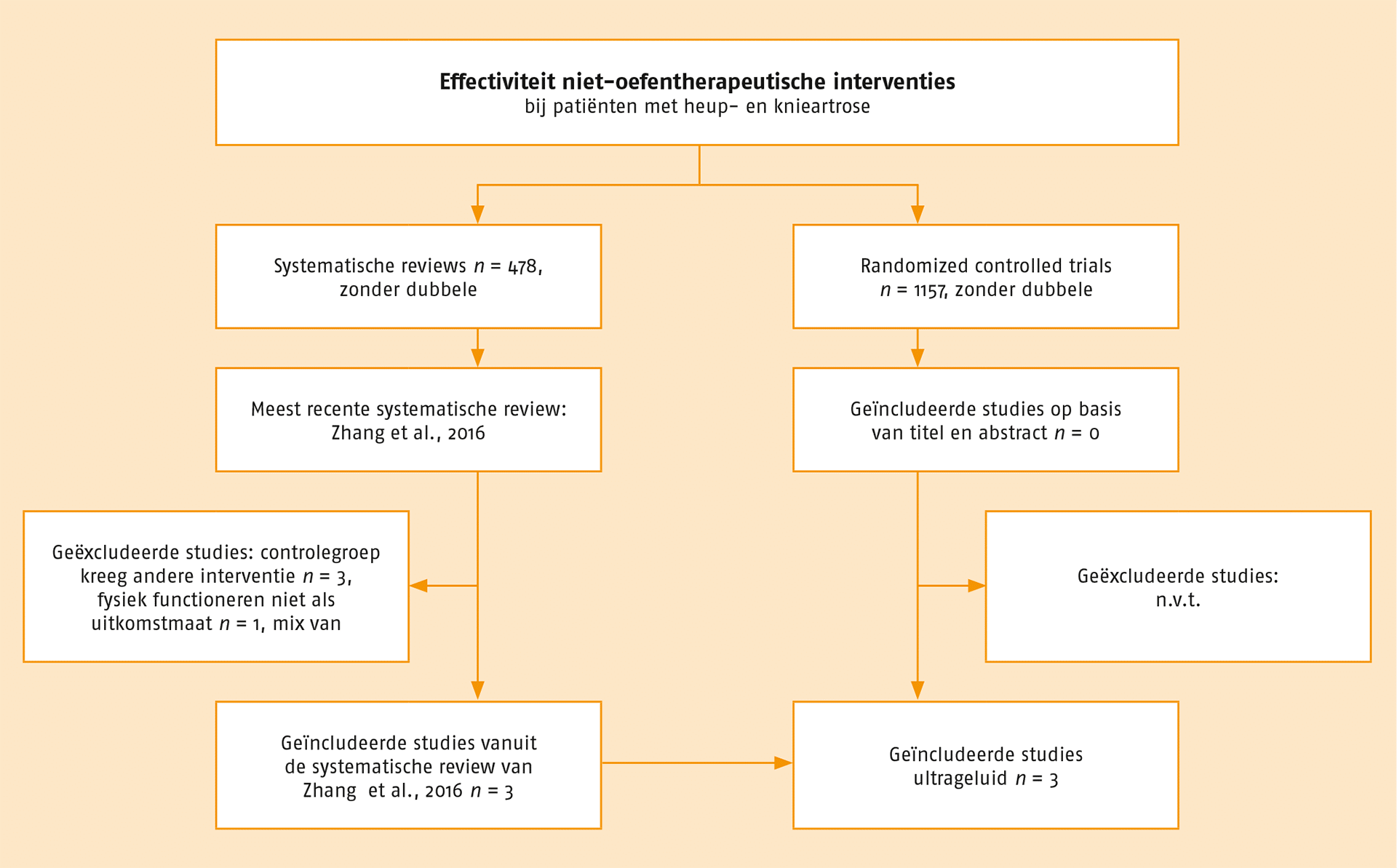 De literatuursearch met betrekking tot niet-oefentherapeutische interventies, waaronder behandeling met ultrageluid, bij patiënten met heup- en knieartrose leverde 478 SR’ en 1157 RCT’s op. De systematische review van Zhang et al. vormt de basis voor beantwoording van deze uitgangsvraag.[1] Deze review omvatte literatuur tot september 2015 en scoort goed op de AMSTAR (7/10). Het KNGF heeft het systematische literatuuronderzoek van Zhang et al. gecomplementeerd met een search naar RCT’s tot 14 augustus 2017. Uiteindelijk voldeden drie RCT’s (n = 119) aan de selectiecriteria bij de uitgangsvraag.[2-4]