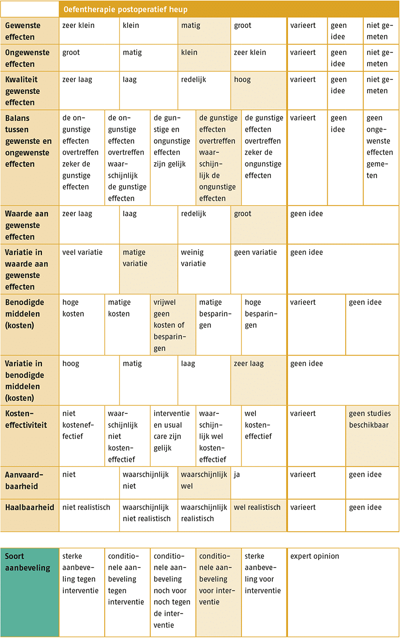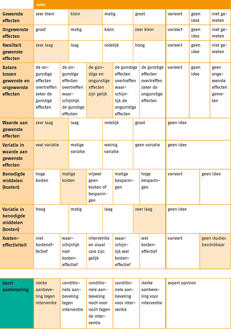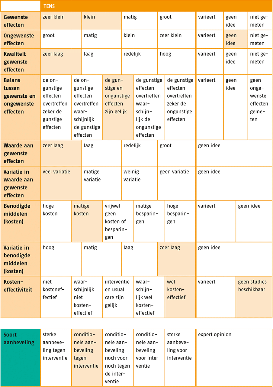 Voor het bepalen van de formulering (richting en sterkte) van aanbevelingen zijn, naast de conclusie uit de wetenschappelijke literatuur, ook aanvullende overwegingen (o.a. waarden/voorkeuren van de patiënt, toepasbaarheid in de praktijk) meegenomen. Hiervoor is de ‘Evidence to decision’ methode van GRADE gevolgd en het bestaande ‘GRADE evidence to decision’ formulier in het Nederlands vertaald. Dit formulier is door de werkgroep tijdens een werkgroepvergadering besproken, waarna de formulering van de aanbeveling is bepaald.