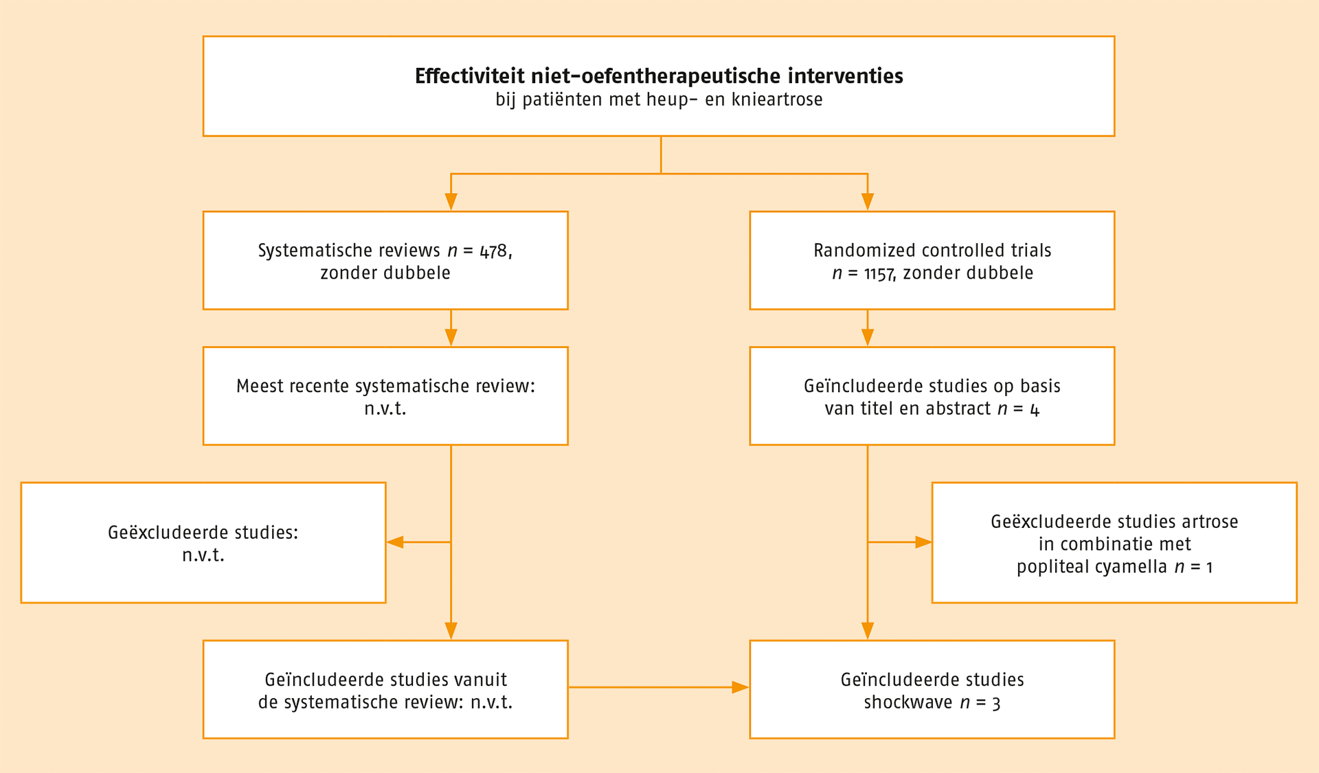 Er is door het KNGF op 14 augustus 2017 een zoekactie uitgevoerd in PubMed, EMBASE, Web of Science, Cochrane Library, CENTRAL, EmCare en CINAHL, naar samenvattingen van de literatuur (i.e. systematische reviews; SR’s) en randomised controlled trials (RCT’s) met betrekking tot de effectiviteit van behandeling met shockwave bij patiënten met heup- en knieartrose.