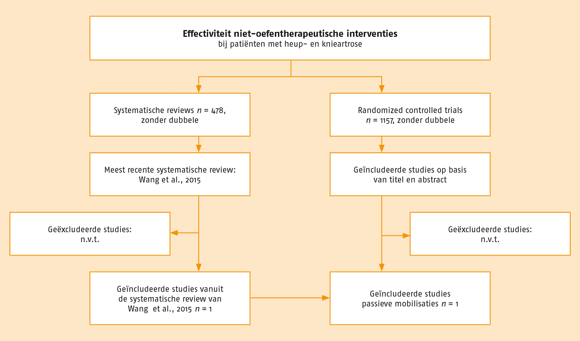 De literatuursearch met betrekking tot niet-oefentherapeutische interventies, waaronder passieve mobilisaties, bij patiënten met heup- en knieartrose leverde 478 SR’s en 1157 RCT’s op. De SR van Wang et al. vormt de basis voor beantwoording van deze uitgangsvraag.[1] De review omvat literatuur tot oktober 2014 en scoort goed op de AMSTAR (10/10). Het KNGF heeft de review van Wang et al. gecomplementeerd met een search naar RCT’s tot 14 augustus 2017. Uiteindelijk voldeed één RCT (n = 86) aan de selectiecriteria bij de uitgangsvraag.[2]