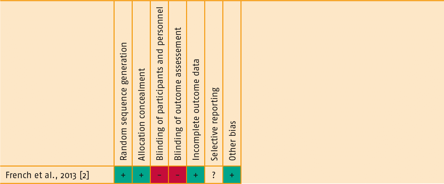 Uitkomstmaat ‘fysiek functioneren’ (door de patiënt gerapporteerde uitkomsten) bij vergelijking van passieve mobilisaties plus oefentherapie vs. enkel oefentherapie: De studie van French, 2013 [2] had een lage RoB, dus er vindt geen afwaardering plaats op basis van design.[2] Inconsistentie en mate van indirectheid waren niet van toepassing en behoefden geen afwaardering. Onnauwkeurigheid was van toepassing vanwege het geringe aantal deelnemers (n = 86). De kans op publicatiebias lijkt reëel, daarom is hiervoor afgewaardeerd. De kwaliteit van bewijs is laag.
