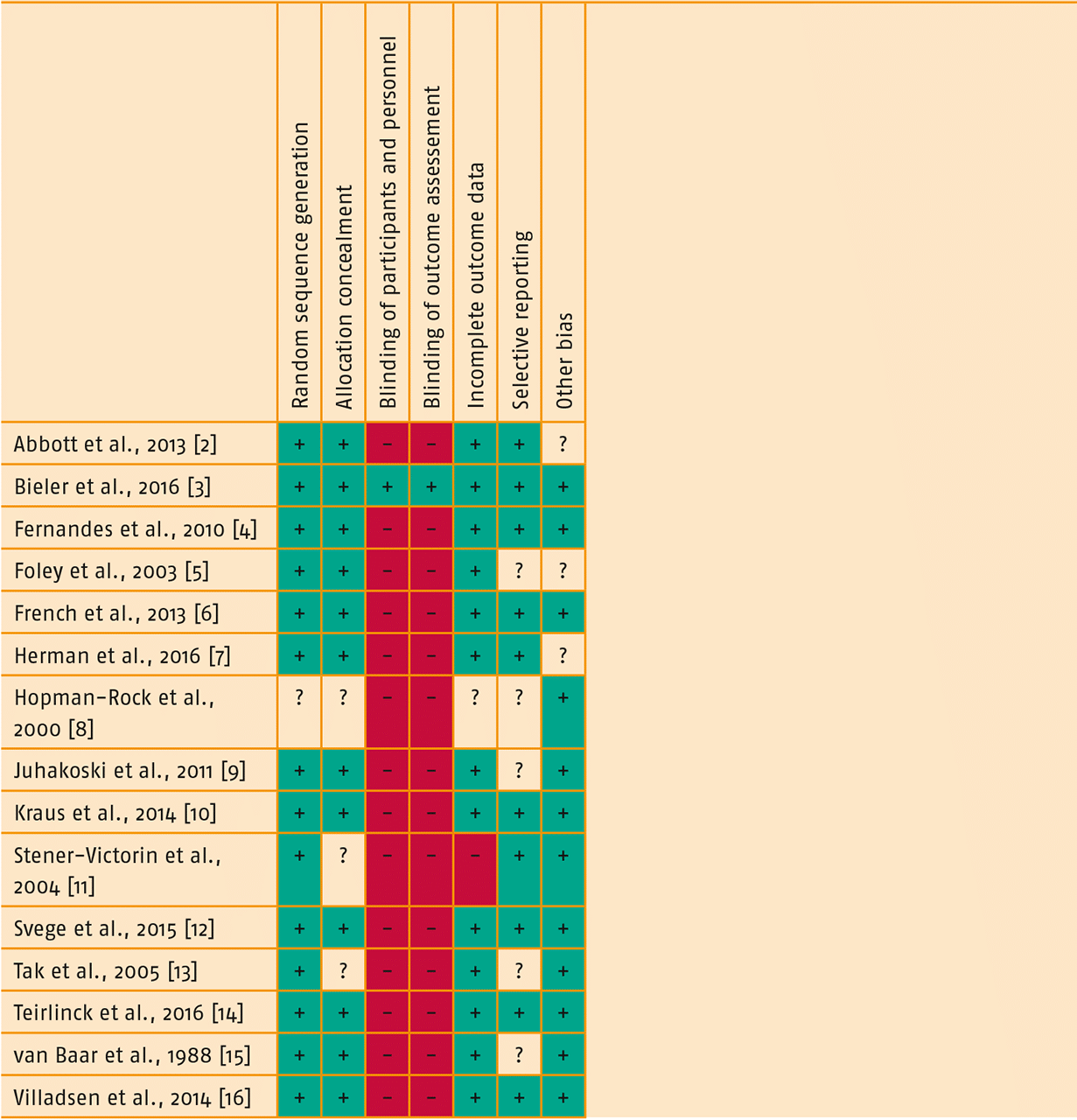 Uitkomstmaat ‘fysiek functioneren’ (door de patiënt gerapporteerde uitkomsten). De studies hebben een redelijk RoB, dus er vindt afwaardering plaats op basis van design. Inconsistentie en mate van indirectheid waren niet van toepassing en behoefden geen afwaardering. Onnauwkeurigheid was van toepassing vanwege het geringe aantal deelnemers (n = 119). De kans op publicatiebias lijkt reëel, daarom is hiervoor afgewaardeerd. De kwaliteit van bewijs wordt op basis van GRADE als ‘laag’ beoordeeld.