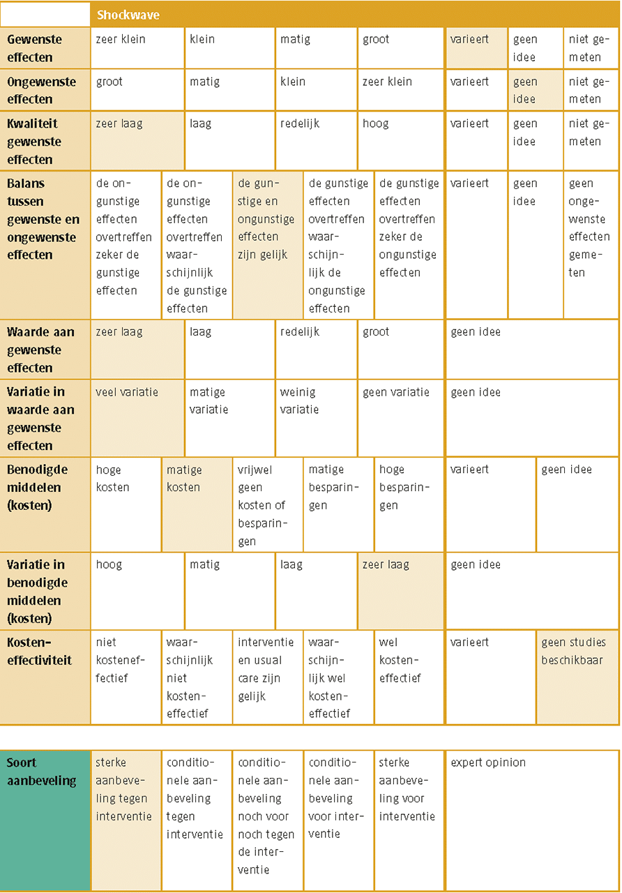 Voor de uitkomstmaat ‘fysiek functioneren’ (patiëntgerapporteerde uitkomsten) bij vergelijking van shockwave vs. geen shockwave. De drie studies hadden een lage RoB, dus er vindt geen afwaardering plaats op basis van design. Vanwege inconsistentie vond afwaardering plaats. Mate van indirectheid was niet van toepassing en behoefde geen afwaardering. Onnauwkeurigheid was van toepassing vanwege het geringe aantal deelnemers (n = 193). De kans op publicatiebias lijkt reëel, daarom is hiervoor afgewaardeerd. De kwaliteit van bewijs wordt op basis van GRADE als ‘zeer laag’ beoordeeld.