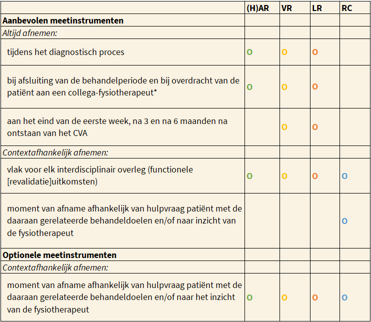 (H)AR = (hyper)acute (revalidatie)fase; VR = vroege revalidatiefase; LR = late revalidatiefase; RC = revalidatie in de chronische fase. O De fase waarin het aanbevolen/optionele meetinstrument wordt afgenomen.