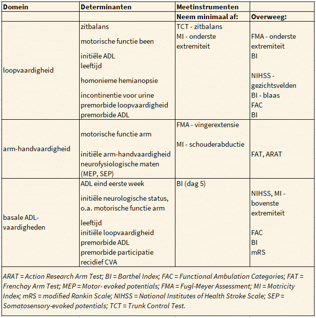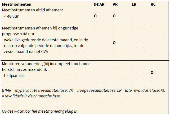 Deze meetinstrumenten kunnen zowel diagnostisch als evaluatief worden ingezet. Ze zijn geselecteerd op grond van hun betrouwbaarheid, responsiviteit, predictieve en constructvaliditeit en tot slot, hun praktische toepasbaarheid. Niet alle metingen hoeven in een keer afgenomen te worden; afname kan ook gefaseerd, afhankelijk van de belastbaarheid van de patiënt en de ernst van het CVA.