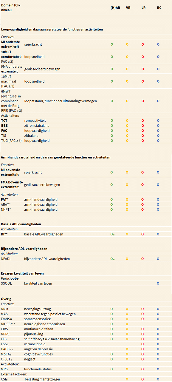 10MLT = Tien-meter looptest; 6MWT = Zes-minuten wandeltest; ARAT = Action Research Arm Test; BI = Barthel Index; BBS = Berg Balance Scale; Borg RPE = Borg Rating of Perceived Exertion; CIRS = Cumulative Illness Rating Scale; CSI = Caregiver Strain Index; EmNSA = Erasmus MC modificatie van het (revised) Nottingham Sensory Assessment; FAC = Functional Ambulation Categories; FAT = Frenchay Arm Test; FES = Falls-Efficacy Scale; FMA = Fugl-Meyer Assessment; FSS = Fatigue Severity Scale; HADS = Hospital Anxiety and Depression Scale; MAS = Modified Ashworth Scale; MI = Motricity Index; MoCA = Montreal Cognitive Assessment; mRS = Modified Rankin Scale; NEADL = Nottingham Extended ADL index; NIHSS = National Institutes of Health Stroke Scale; NHPT = Nine Hole Peg Test; NNM = Goniometer volgens de Neutrale-0-Methode; NPRS = Numeric Pain Rating Scale; O-LCT = O-Letter Cancellation Test; SSQoL = Stroke-Specific Quality Of Life scale; TCT = Trunk Control Test; TIS = Trunk Impairment Scale; TUG = Timed Up and Go test.