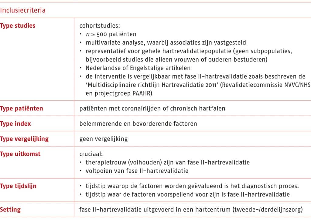 In overleg met de werkgroep is besloten om geen systematische zoekactie uit te voeren, maar de informatie die nodig is voor het beantwoorden van deze uitgangsvraag op niet-systematische wijze te vergaren en narratief uit te werken met behulp van de kennis en klinische expertise van de werkgroep en om aan te sluiten bij de ‘Multidisciplinaire richtlijn hartrevalidatie 2024 (opent in nieuw tabblad) ’ (NVVC).
