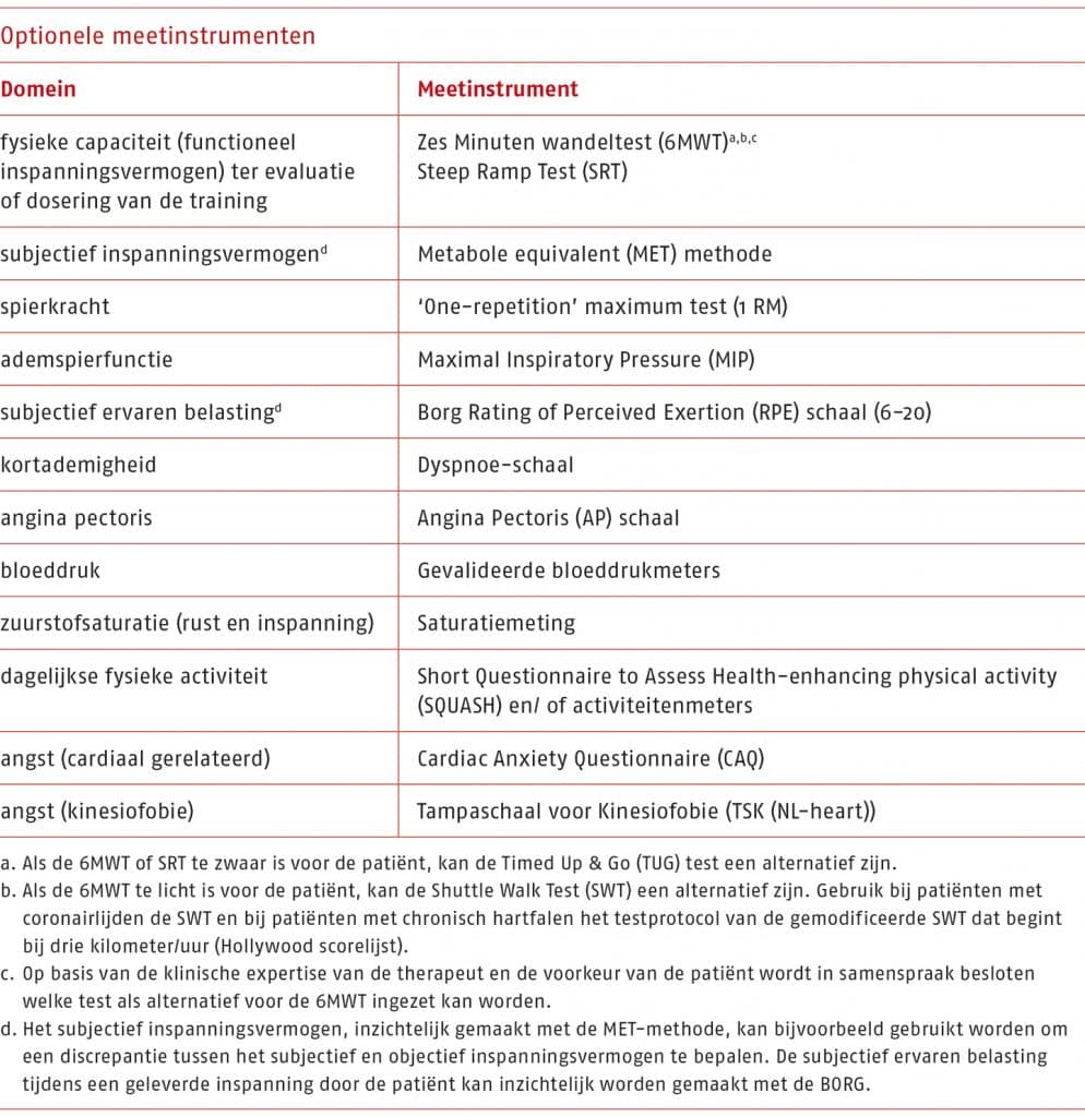 - Gedurende het gehele hartrevalidatieprogramma beoordeelt de therapeut met de patiënt of het ingezette beweegprogramma nog voldoende op de patiënt is afgestemd. Overleg met het multidisciplinair hartrevalidatieteam of aanpassing van het hartrevalidatieprogramma noodzakelijk is. Zie hiervoor ook C.7 ‘Evaluatie, stopcriteria en afsluiting van de behandeling’.