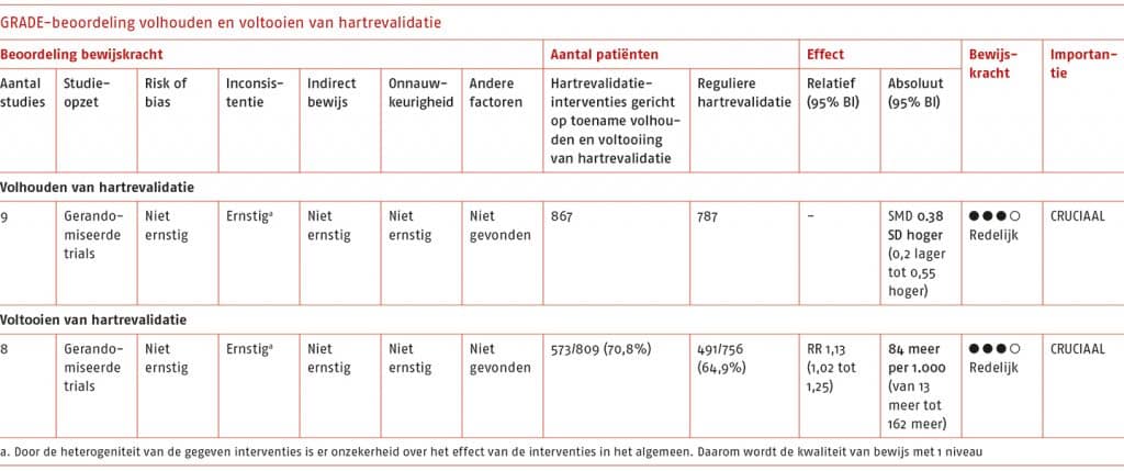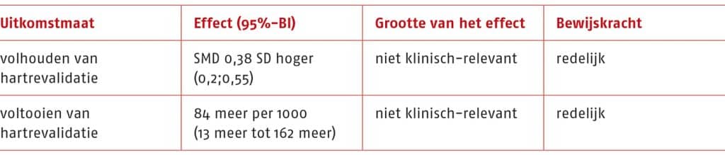 Toelichting: Er is een niet klinisch-relevant effect (RR 1,13) gevonden op het volhouden van hartrevalidatie in het voordeel van de interventies die zich richten op het voltooien van hartrevalidatie ten opzichte van reguliere hartrevalidatie bij patiënten met coronairlijden en chronisch hartfalen in fase II-hartrevalidatie, waarbij de bewijskracht van deze resultaten redelijk is, waardoor we redelijk zeker zijn van dit effect dat vanuit de literatuur is aangetoond.