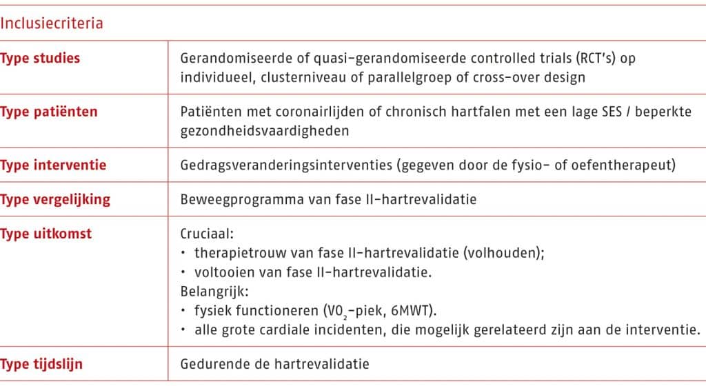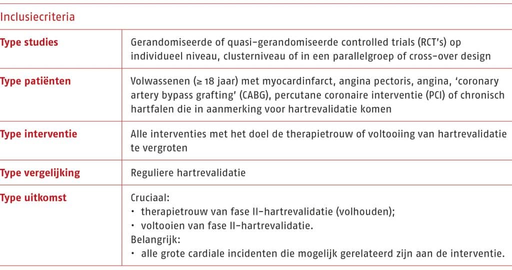 Deze interventies worden in het systematisch literatuuronderzoek vergeleken met een basisvoorlichting over beweging, hartrevalidatie in de gemeenschap of reguliere hartrevalidatie.