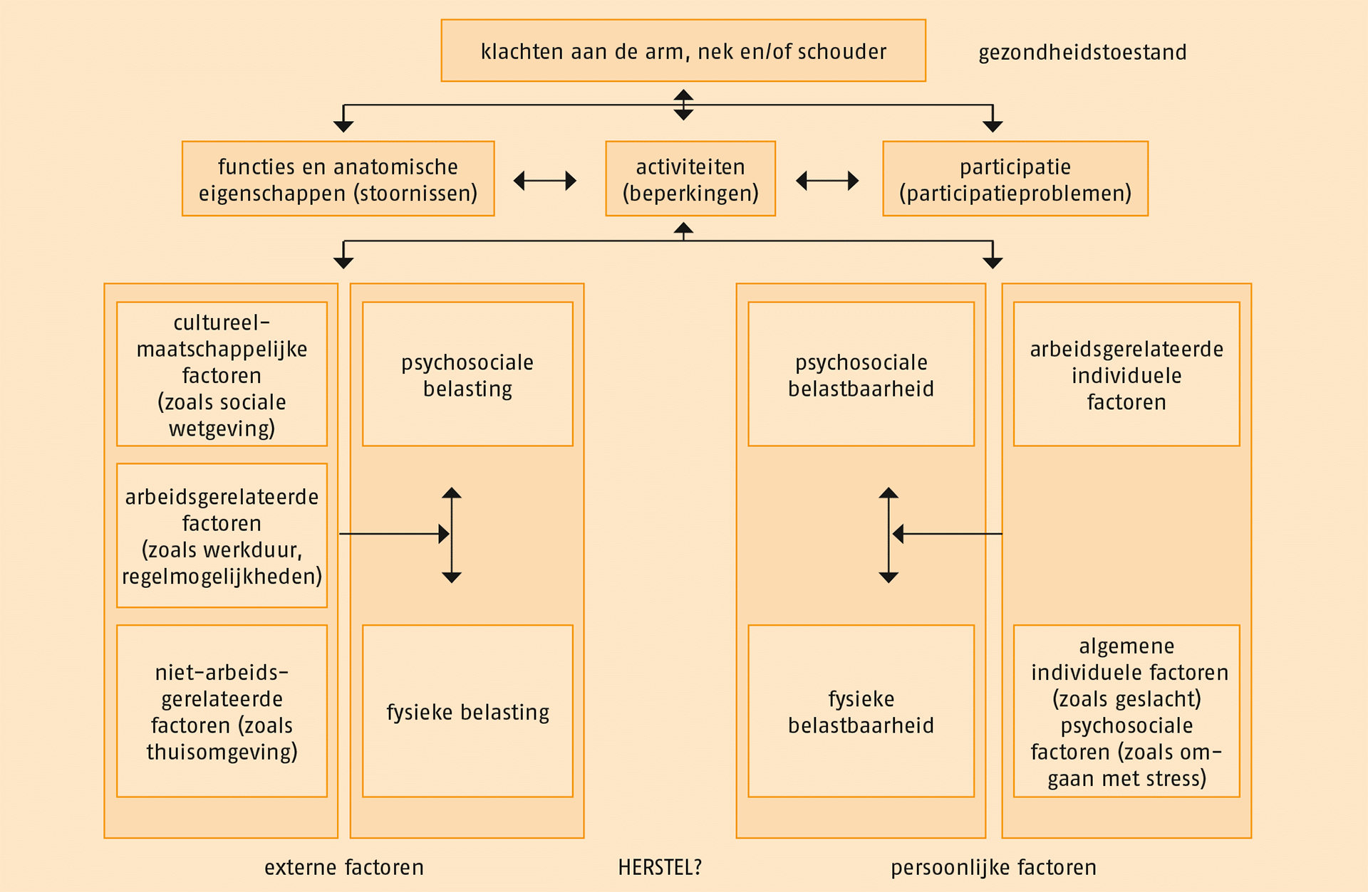 In de volgende figuur is de relatie weergegeven tussen de gezondheidstoestand van de patiënt, de externe (cultureelmaatschappelijke en al dan niet arbeidsgerelateerde) factoren, die de belasting bepalen, en de persoonlijke factoren, die de belastbaarheid bepalen. De gezondheidstoestand van de patiënt, de externe en de persoonlijke factoren beïnvloeden elkaar positief of negatief.