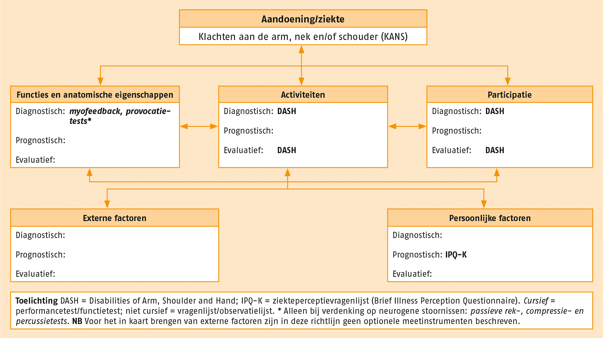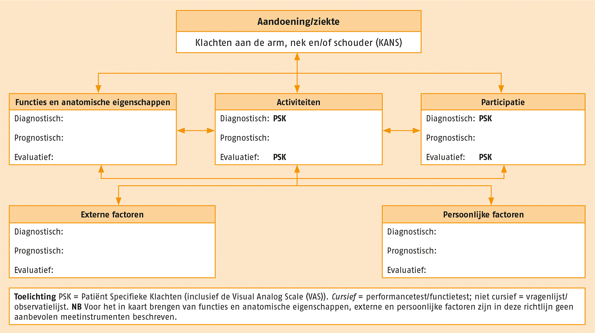 NB Voor het in kaart brengen van functies en anatomische eigenschappen, externe en persoonlijke factoren zijn in deze richtlijn geen aanbevolen meetinstrumenten beschreven.