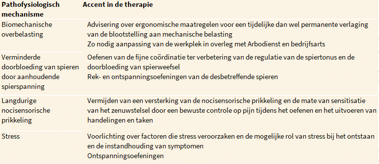 In deze richtlijn worden pathofysiologische mechanismen onderscheiden die samenhangen met de biomechanische overbelasting van het bindweefsel en met de spierspanningregulatie en de activatie van het zenuwstelsel. Voor elk van deze mechanismen worden aandachtspunten gepresenteerd die de fysiotherapeut kunnen helpen bij de keuze voor een of meer verrichtingen.