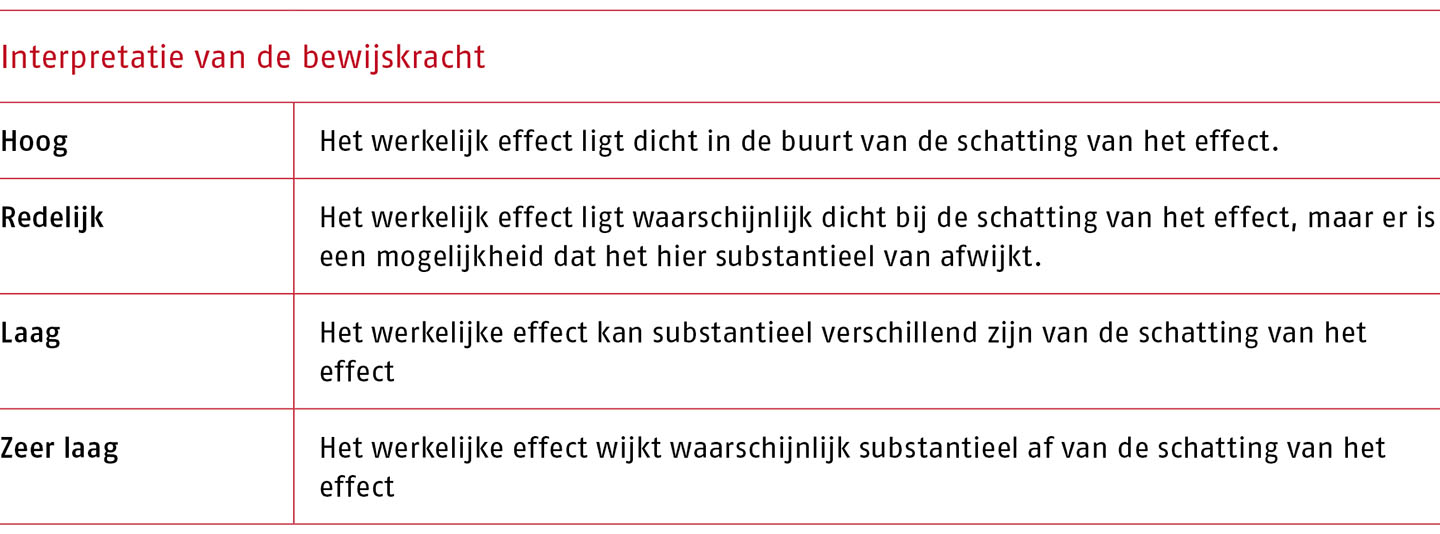 De GRADE-systematiek kent vier niveaus van de bewijskracht: ‘hoog’, ‘redelijk’, ‘laag’ of ‘zeer laag’.