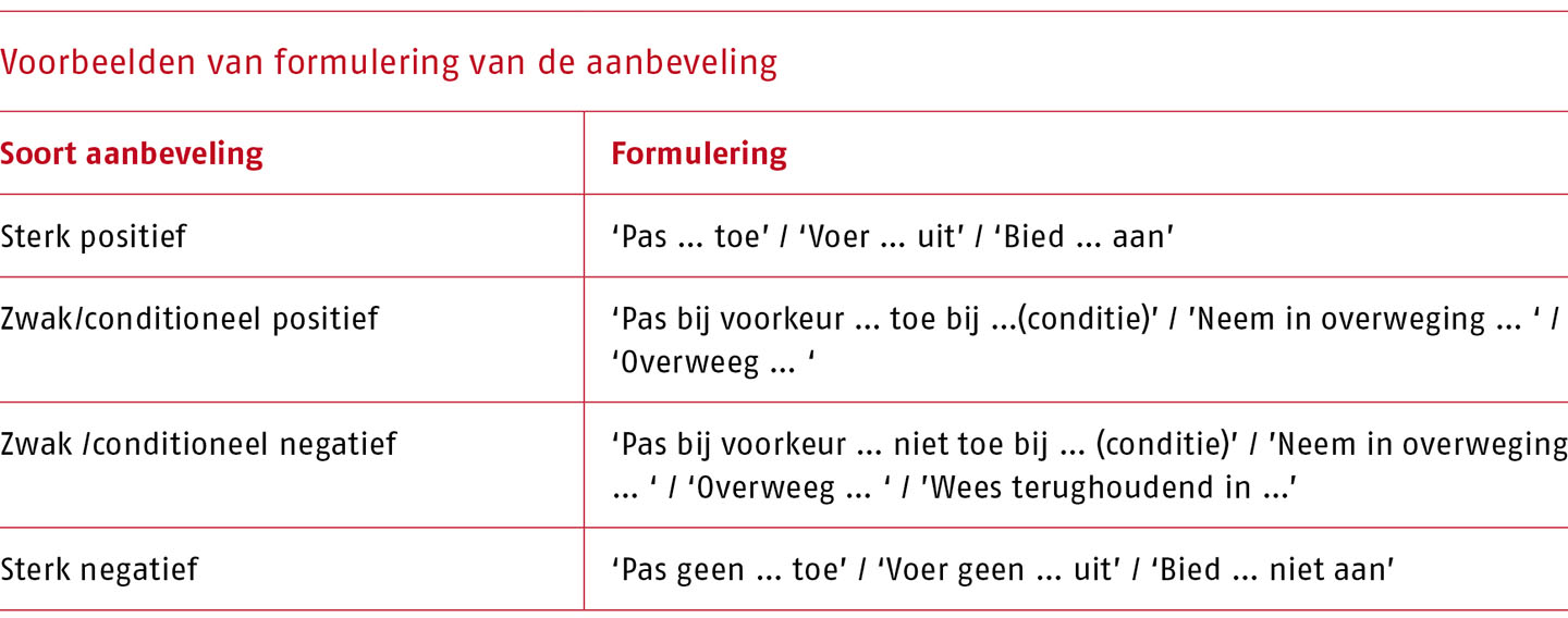 Nadat de bewijskracht en de grootte van het effect waren bepaald, formuleerden subgroepjes van werkgroep- en klankbordgroepleden de overige overwegingen, die vervolgens in acht bijeenkomsten met de werkgroep en zes consultaties van de klankbordgroep zijn besproken aan de hand van het GRADE-’evidence-to-decision’proces (Alonso-Coello 2016a,b), totdat consensus was bereikt. Op basis van het wetenschappelijk bewijs en de overige overwegingen zijn vervolgens de richting en sterkte van de aanbeveling bepaald. Op grond daarvan is tot slot de aanbeveling bij voorkeur als volgt geformuleerd: