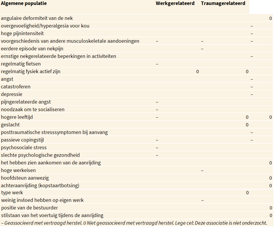 De volgende tabel geeft een overzicht van de prognostische factoren voor een vertraagd herstel, die zijn bepaald na een nekpijnepisode van 6-12 maanden. 22,40,41,43,45-47