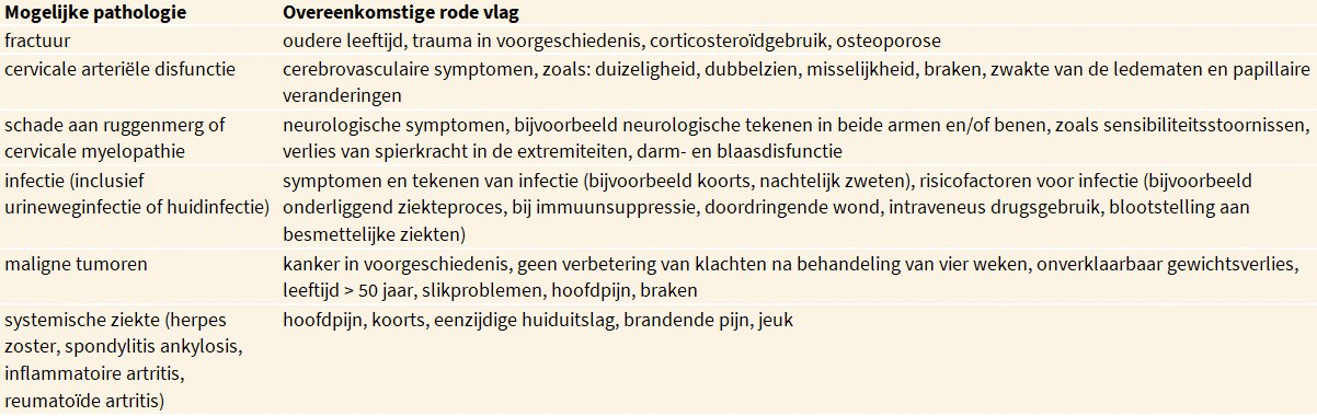 De fysiotherapeut dient allereerst nekpijn graad IV uit te sluiten. De screening vindt plaats aan de hand van de voor deze aandoening bekende rode vlaggen. Door te screenen op deze specifieke oorzaken van nekpijn wil de fysiotherapeut achterhalen of er aanwijzingen zijn voor onderliggende ernstige pathologie, waarvoor verdere medische diagnostiek vereist is. In de volgende tabel zijn de rode vlaggen opgenomen die in de literatuur beschreven staan en over het algemeen zijn opgenomen in internationale richtlijnen. De mogelijke pathologie die bij deze rode vlaggen hoort, is gedefinieerd door de Neck Pain Task Force.4,5