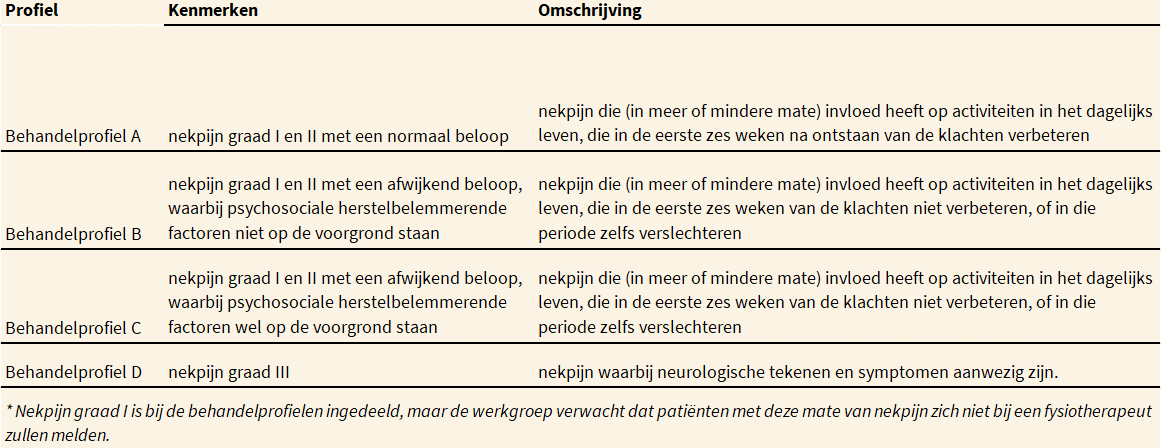 | Behandelprofiel A | nekpijn graad I en II met een normaal beloop | nekpijn die (in meer of mindere mate) invloed heeft op activiteiten in het dagelijks leven, die in de eerste zes weken na ontstaan van de klachten verbeteren |