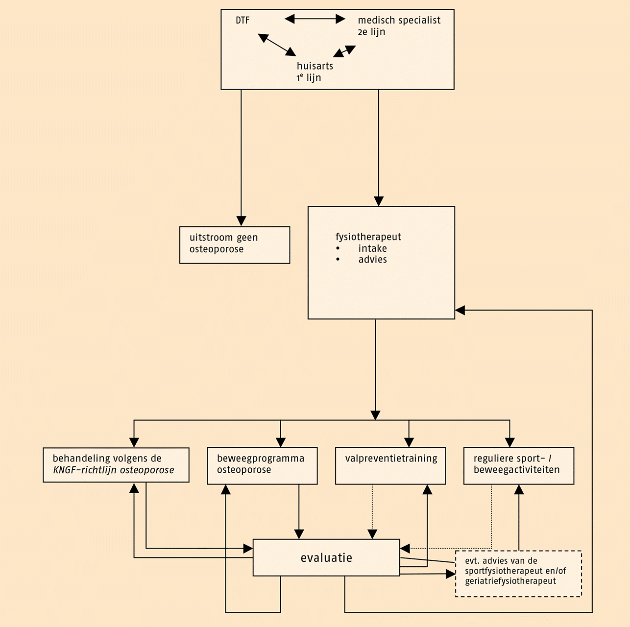 Omdat de morbiditeit bij mensen met osteoporose voornamelijk wordt veroorzaakt door het optreden van fracturen is het zinvol om de interventie ook te richten op het reduceren van de fractuurincidentie. Dit kan enerzijds door het verhogen van de botdichtheid, en anderzijds door het reduceren van het valrisico of het reduceren van de impact van de val. Om dit te bereiken kan de fysiotherapeut kiezen voor een individueel oefenprogramma of mensen verwijzen naar een beweegprogramma dat zich specifiek richt op inactieve mensen met osteoporose. Een beweegprogramma is met name geschikt voor patiënten die niet voldoen aan de Nederlandse Norm Gezond Bewegen of aan de fitnorm (de zogeheten combinorm), en die na behandeling volgens de KNGF-richtlijn, moeite hebben met het ontwikkelen of onderhouden van een actieve leefstijl. Om te voldoen aan Nederlandse Norm Gezond Bewegen moeten 55-plussers ten minste 5 dagen per week en het liefst elke dag ten minste 30 minuten lichamelijk actief zijn. Voor de fitnorm moeten volwassenen ten minste 3 keer per week 20 minuten inspannende lichaamsbeweging uitvoeren. In de volgende figuur is de plaats in de zorgketen weergegeven van de KNGF-richtlijn ten opzichte van een Beweegprogramma Osteoporose.