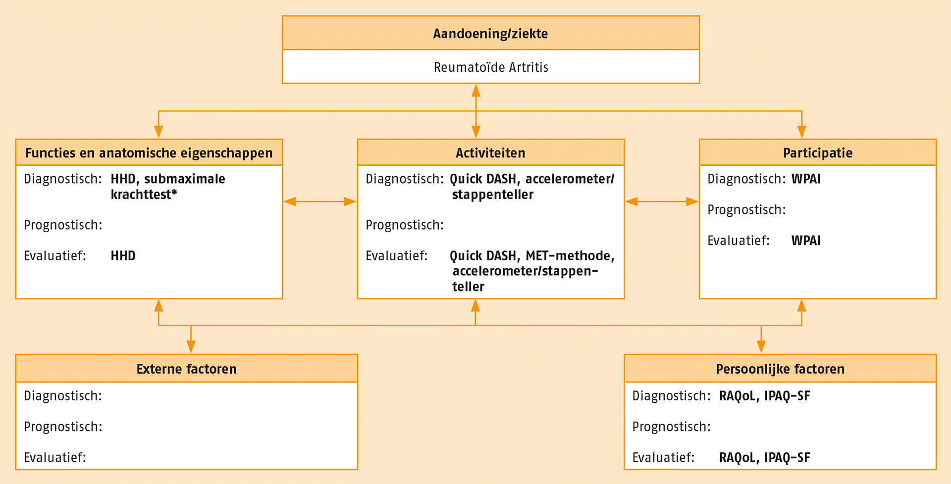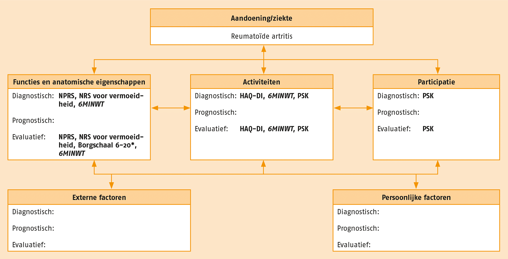 De ‘ICF Core Set for rheumatoid arthritis’ geeft het spectrum van beperkingen bij patiënten met RA weer en is gevalideerd vanuit het perspectief van de fysiotherapeut. Ze vormt de basis voor de anamnese bij patiënten met RA. Het doel van het diagnostisch proces is de ernst, de aard en de mate van beïnvloedbaarheid van het gezondheidsprobleem te inventariseren. De anamnese maakt hier deel van uit. Uitgangspunt is de hulpvraag die de patiënt zelf formuleert. De therapeut inventariseert de hulpvraag en de hiermee verband houdende gezondheidsproblemen aan de hand van de ‘ICF Core Set for rheumatoid arthritis’. Zie figuur 5.1.