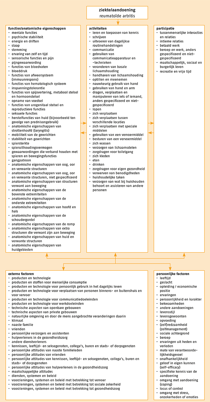 Deze vraag is beantwoord door de domeinen te beschrijven uit de ‘International Classification of Functioning, Disability and Health (ICF) Core Set for rheumatoid arthritis’, die relevant zijn voor de anamnese, uitgesplitst naar functies en anatomische eigenschappen, activiteiten, participatie, externe en persoonlijke factoren.[1]
