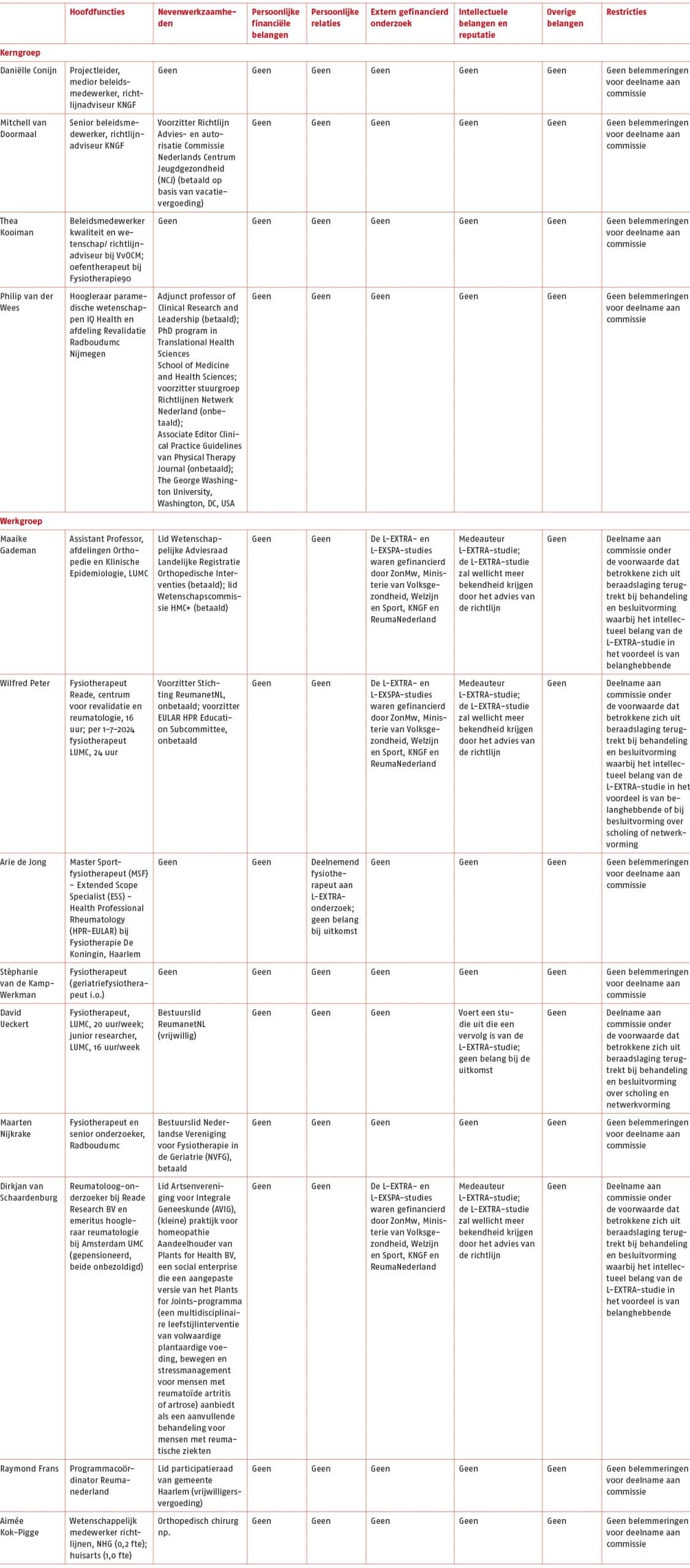 Voorafgaand aan en bij afsluiting van het project hebben alle projectgroep leden een belangenverklaring ingevuld. De belangenverklaringen zijn beoordeeld door de richtlijnadviseurs en indien nodig (bij een ‘conflict of interest’) werden gedurende het richtlijnproject maatregelen getroffen (bijv. het niet participeren in het proces ‘van bewijs naar aanbeveling’ in de werk- of klankbordgroep) om (schijn van) oneigenlijke beïnvloeding door belangenverstrengeling zo veel mogelijk te voorkomen, conform de KNGF-richtlijnenmethodiek 2022. (9)
