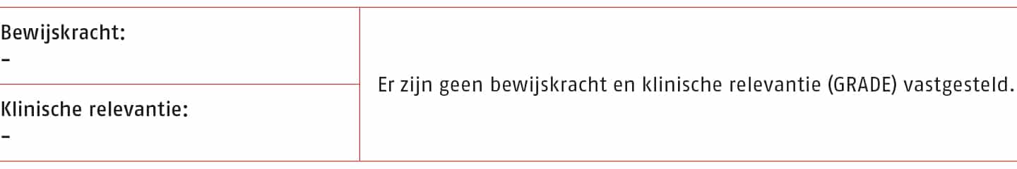 In deze module is er bij het beantwoorden van de uitgangsvraag geen effect of bewijskracht vastgesteld. De effecten en bewijskracht van langdurige gepersonaliseerde gesuperviseerde actieve oefentherapie zijn uitgewerkt in module C.2.3 ‘Oefentherapie met intensieve begeleiding’ (opent in nieuw tabblad). Om die reden heeft de werkgroep geen gewenste effecten, ongewenste effecten, kwaliteit van bewijs en balans van gewenste en ongewenste effecten (vier van de negen criteria) geformuleerd.