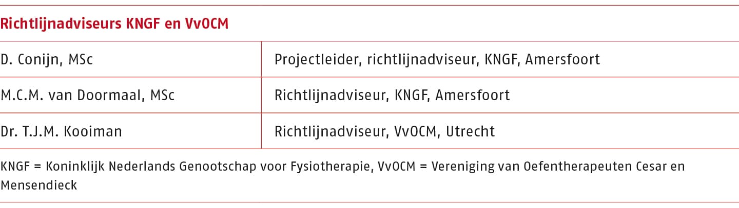 Het initiatief voor deze modulaire herziening lag bij het Koninklijk Nederlands Genootschap Fysiotherapie (KNGF), in samenwerking met de Vereniging van Oefentherapeuten Cesar en Mensendieck (VvOCM).