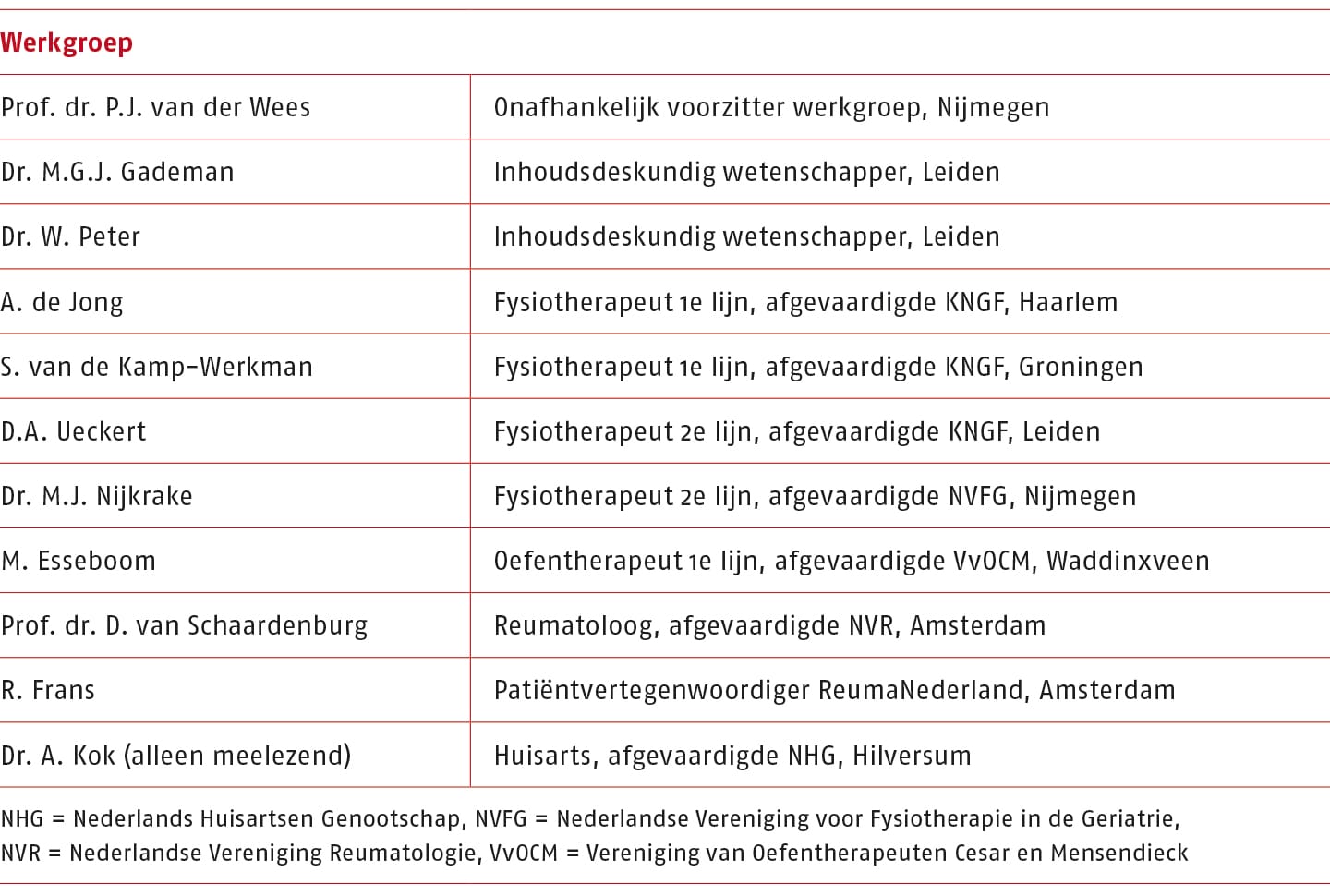 De rollen en taken van de belanghebbenden van de richtlijn worden beschreven in de KNGF-richtlijnenmethodiek (8).