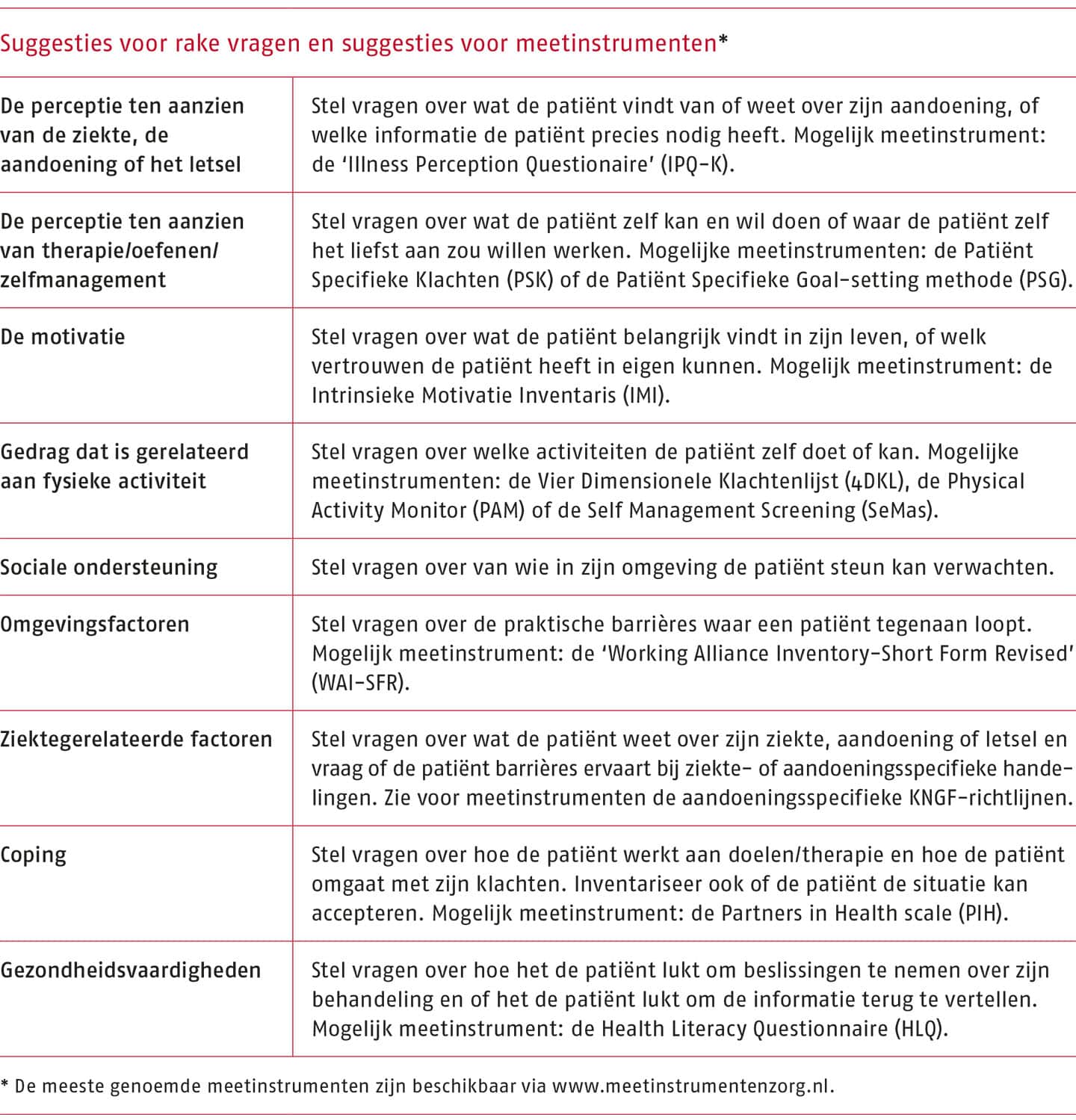 In de volgende tabel staan per overkoepelende factor suggesties voor rake vragen en suggesties voor meetinstrumenten.