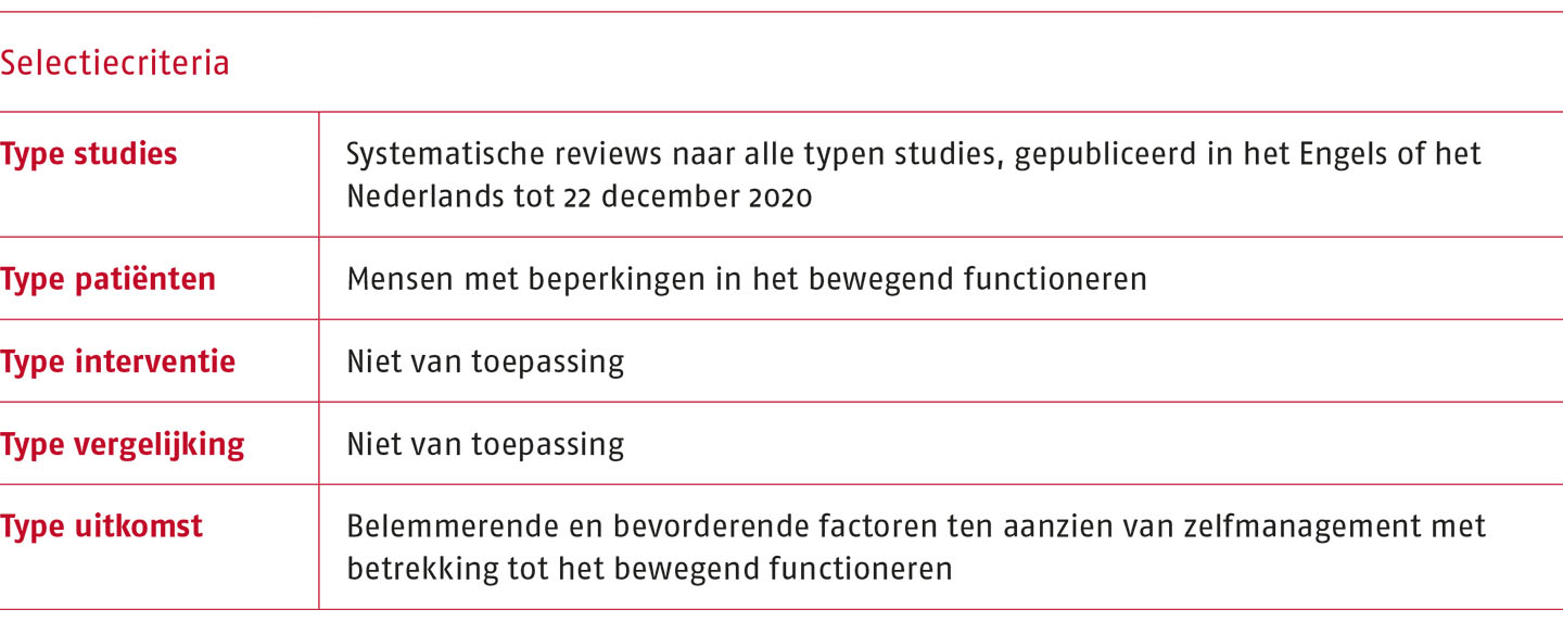 Voor de beantwoording van deze uitgangsvraag is op 22 december 2020 een systematische zoekactie uitgevoerd in PubMed, Embase, Web of Science, CINAHL en Cochrane naar bevorderende en belemmerende factoren voor zelfmanagement met betrekking tot het bewegend functioneren. Zie bijlage B.1-1 (opent in nieuw tabblad) voor de zoekverantwoording van deze uitgangsvraag. Op basis van de selectiecriteria is gezocht naar systematische reviews, die werden geïncludeerd als ze aan de inclusiecriteria voldeden. De selectiecriteria zijn opgenomen in de volgende tabel.